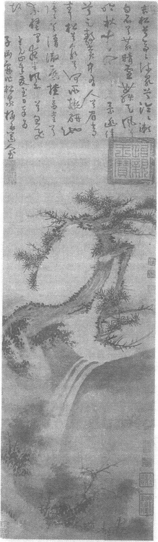元。吴镇(见《吴镇双桧平远图轴》条目)绘。纸本墨笔。纵105.6厘米,横31.7厘米,江苏省南京博物院藏。图中坡岭之上斜生一株奇松,健拔雄劲,有凌空之势,犹如一条腾跃而起的苍龙,曲挺的树干是龙的躯身,折转的枝权是龙的臂爪。松针稀疏,刚硬坚直。苔藓、杂草依树而生,松枝下流泉飞泻,隐没在山脚的灌木丛中。此图景色简单,平中带险,笔墨多变。松树的枝干以秃笔干墨勾皴擦染,松针则以细笔焦墨写成,坡岭灌木墨色温润,富有层次感。画幅上方作者自题诗云:“长松兮亭亭,流泉兮泠泠,漱白石兮散晴雪,舞天风兮吟秋声。景幽佳兮足静赏,中有人兮眉青青。松兮泉兮何所拟,研池阴阴兮清澈底。挂高堂兮素壁间,夜半风雷兮忽飞起。”款署:“至元四年夏至日,奉为子渊戏作松泉,梅花道人书。”下钤<梅花盦>、<嘉兴吴镇仲圭书画记>二印。至元四年为公元1338年,吴镇59岁。此图曾由孙承泽、安歧收藏。卷后有汪士鋐、高士奇、樊增祥、罗振玉等人的题跋。