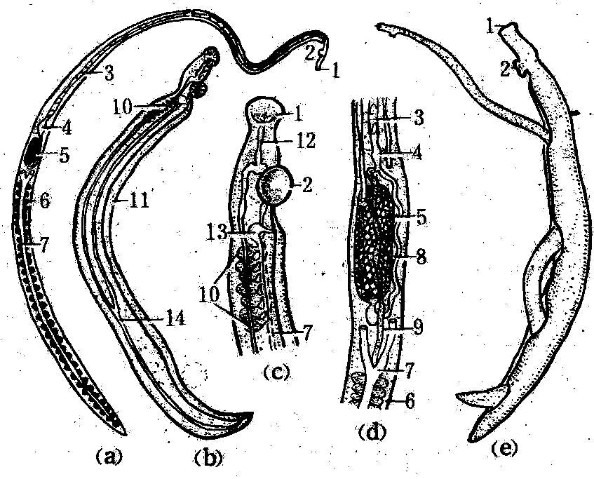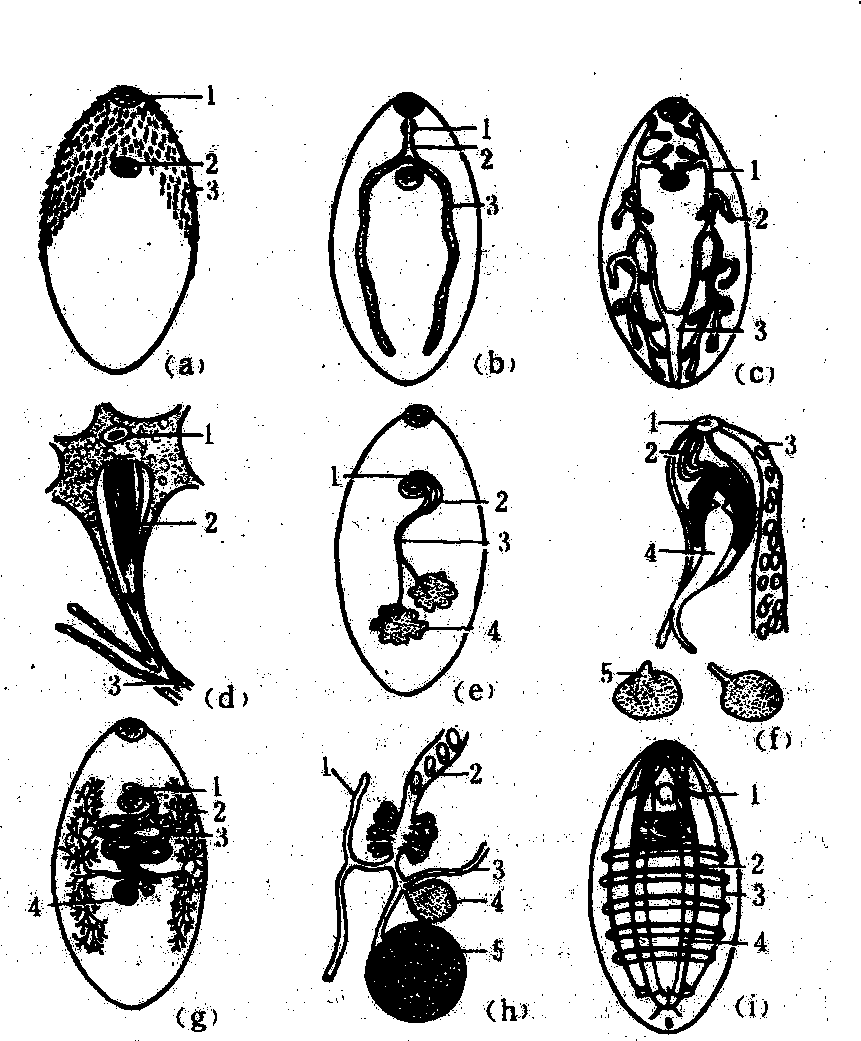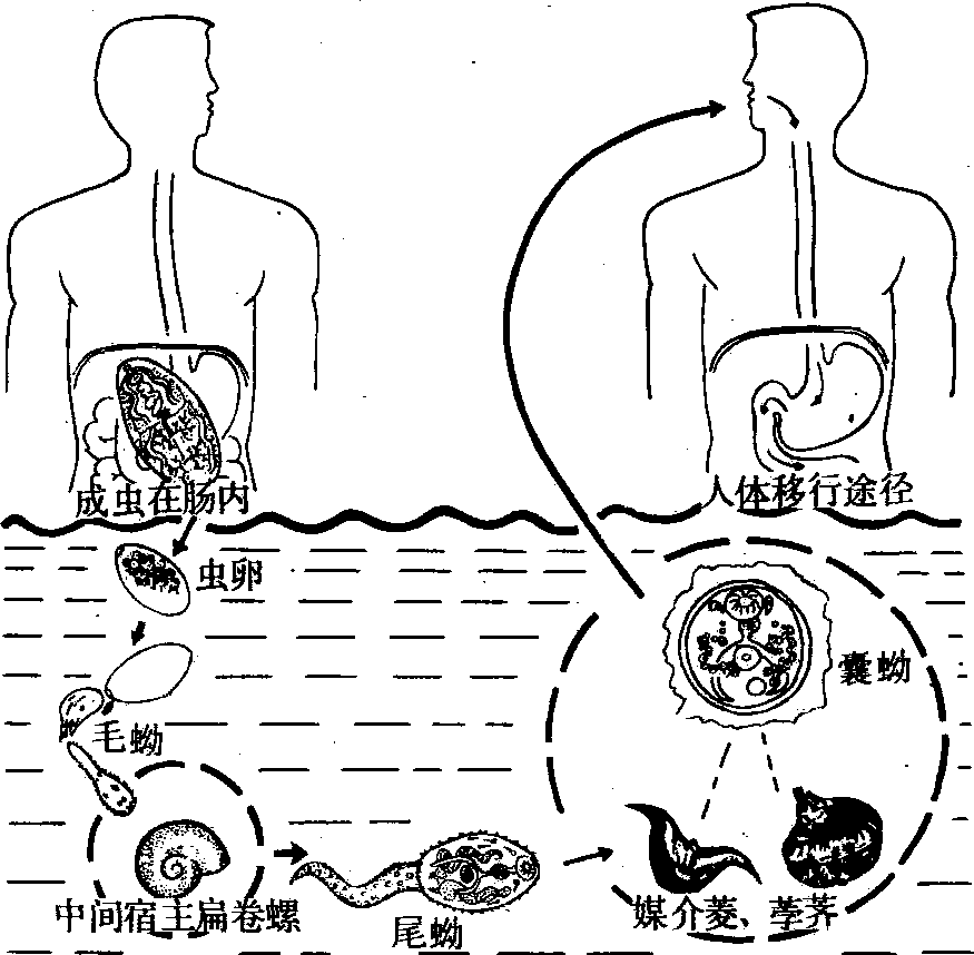 有的吸虫生活史,在螺体内无雷蚴期,但有二代胞蚴期; 有的尾蚴无需侵入第二中间宿主体内,而附在水生植物上,分泌囊壁形成囊蚴(如肝片吸虫、姜片虫);另外有些种类的尾蚴则直接侵入终宿主体内发育为成虫(如日本血吸虫)。 分类及重要种类 主要分二亚纲。 单殖亚纲(Monogenea) 是水生变温脊椎动物体表、鳃腔、口腔、膀胱、生殖腔或体腔内的寄生虫。虫体前端有头吸器,后端有一大而强有力的后吸器,上面有钩或锚。直接发育,生活史中只有一个宿主,如寄生在鱼的皮肤或鳃上的三代虫(Gyrodactylus)。体扁平纵长,长约0.2~0.8mm。前端分两瓣,每瓣有一头吸器。后吸器圆盘形,有一对大钩与16个边缘小钩,用以固着于宿主的皮肤上。身体腹面在体前1/4处有口,口后有咽、食管及盲肠。雌雄同体,生殖孔开于口后。子宫内有子代胚胎,子代胚胎内又有孙代胚胎,故名三代虫。 复殖亚纲(Digenea) 寄生在动物及人体内的吸虫,危害严重。多数为扁平叶状,有些种类细而长,虫体长大于宽,前端较尖。大多数有口吸盘和腹吸盘。口吸盘围于口周,腹吸盘在体中央或体后端。体表一般有体棘,是科、属的分类依据。大多雌雄同体,生殖器官复杂。发育过程需经过受精卵、毛蚴、胞蚴、雷蚴、尾蚴和囊蚴各阶段。并需转换2个或3个宿主、中间宿主,一般是软体动物、鱼、虾和水生植物。幼虫可行无性生殖,发育成熟的成虫进行有性生殖。终宿主为人和脊椎动物。 主要种类有: ❶华枝睾吸虫 (Clonorchis sinen-sis),寄生于人或哺乳动物的胆管内,可引起华枝睾吸虫病。成虫体形扁平狭长,长10~25mm,宽3~5mm。前端尖细,后端钝圆,体表无棘。口吸盘略大于腹吸盘,口吸盘在虫体前端,腹吸盘在体前1/5处。成虫在胆管内产卵,虫卵随胆汁进入宿主的消化道,并混合在粪便中排出体外。虫卵入水后,被第一中间宿主螺蛳吞食,在螺蛳的消化道中才能孵出毛蚴。中国各地区作为第一中间宿主的螺蛳有3科,7种,常见的有纹沼螺(Parafossarulus striatulus)、长角涵螺(Alocinma longcornis) 和赤豆螺 (Bithynia f u-chsianus)等。毛蚴在螺体内发育为胞蚴和雷蚴,最后成尾蚴从螺体逸出,在水中游动。遇第二中间宿主(淡水鱼或虾),则附着并侵入鱼体肌肉及各个部分,尾部脱落形成囊蚴。中国报道有10科,74种淡水鱼可以作为第二中间宿主。最主要的是鲤科鱼类。囊蚴必须进入人或哺乳动物体内才能发育为成虫。 ❷布氏姜片吸虫(Fasciolopsis buski),寄生于人体的最大吸虫。约20~75×8~20mm。扁平,前端稍尖,后端钝圆。口吸盘直径约0.5mm,腹吸盘呈漏斗状,较口吸盘大4~5倍,两吸盘距离很近。咽及食管均短,肠支在腹吸盘前分叉,向后呈波浪状直至末端。完成其生活史需要两个宿主,即终宿主为人(或猪)。中间宿主为扁卷螺(有4种,即Segmentina caenosus、S. hemis-phaerula、Hippeutis umbilicalis及Gyraulus con-vexiusculus)。尾蚴自螺体逸出后,在水中遇到红菱、荸荠、水浮莲等水生植物即吸附于其表面,脱尾形成囊蚴。人或猪生食带囊蚴的这些植物时,即被感染(图2)。 ❸日本裂体吸虫 (Schistosoma japonicum)。又称日本血吸虫。雌雄异体。雄虫较粗短,大小为10~22×0.5~0.55mm,常向腹面弯曲而呈镰刀状。口吸盘和腹吸盘均明显,虫体两侧自腹吸盘之后向腹面弯卷,形成沟状,一直延至尾端,称抱雌沟,是雄虫抱住雌虫交配的部位。精巢7个(少数虫体可少于或多于7个)单行排列。每个精巢有一输出管,向前汇成输精管,在第一精巢前稍膨胀为储精囊。雌虫较细长,长约12~26mm。前端纤细。卵巢长椭圆形,其后为卵黄腺。输卵管自卵巢后端发出,前行至卵巢前与卵黄管汇合。子宫为一长管,常含虫卵(图3)。 图 2 布氏姜片虫的生活史 图 3 日本血吸虫雌雄成虫