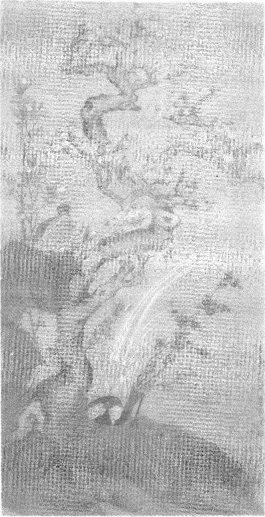 释义 | 周之冕杏花锦鸡图轴 周之冕杏花锦鸡图轴明万历壬寅(公元1602年)。周之冕绘。绢本设色。纵157.8厘米,横83.4厘米。原藏周瘦娟的“紫罗兰庵”,现藏江苏省苏州博物馆。周之冕,生年不详,卒于万历(公元1573—1619年)末年。字服卿,号少谷,江苏吴县人。擅写意花鸟,融陆治设色工致和陈道复水墨写意法于一体,促进了水墨花鸟画的发展。他虽属“吴门画派”系统,但有明代院体传统的余辉。他还是“勾花点叶”法,(即画花用线条勾勒,画叶子用颜色直接点染)一派的代表。他的传世作品有《芙蓉凫鸭图轴》、《竹石雄鸡图》、《桂子图轴》、《梅花野雉图轴》、《花溪鸳鸯图轴》、《松兔图轴》等。此图描绘兀立的奇石,一虬屈粗壮的老杏树,枝桠盛茂,杏花簇簇,红白相映,分外鲜艳。树前坡石上,一只黑腹、白羽、红腿的锦鸡,长尾高扬,伏趴着,偏颈盯着其前面的两只蝴蝶花;树后石顶端,一只橙腹、黑羽、白爪的锦鸡,伫立辛夷下,斜视着欣欣向荣的杏花。图的右侧边缘,有署款“万历壬寅秋暮写,汝南周之冕。”并钤一方印。画面构图丰满,设色妍丽,笔墨工细秀润,尤其锦鸡羽毛的点染,细腻逼真,充分体现了作者描绘飞禽的本领。 ☚ 王问雪景山水图轴 李士达西园雅集图卷 ☛ |