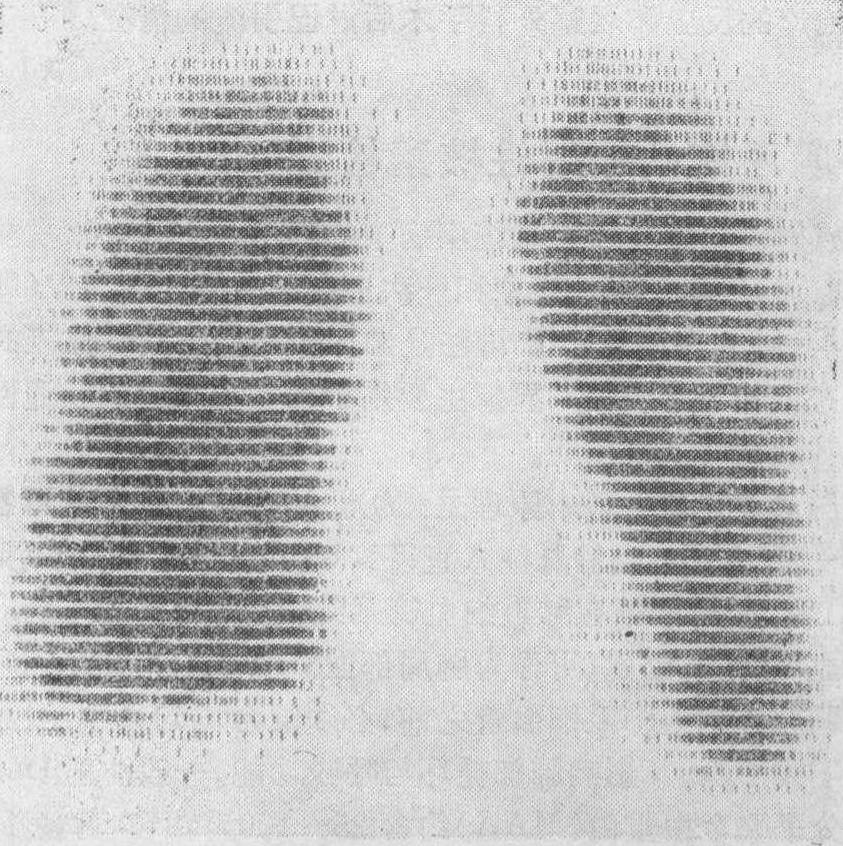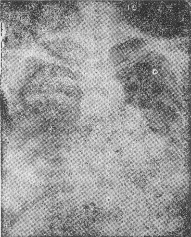 注射显象剂时一般取仰卧位,以减少重力作用的影响,使标记物分布较均匀。但如要观察肺动脉高压对肺血流分布的影响,则以坐位为宜。显象时一般用前后、后前、右侧、左侧四个体位。为了观察下叶及上叶放射性缺损,必要时应增加后斜位及前斜位。患心脏扩大的病人,前后显象,左肺下内缘常为心影所遮,故以后前位为佳。侧位特别是右侧位显象,对显示右肺下叶病变有价值。 肺灌注显象的临床意义如下: (1)正常肺: 前后位,一般右肺面积较大,左肺略小,两肺放射性分布均匀,肺外带边缘及肺尖部放射性分布较稀疏,但轮廓完整。右肺底常呈弧形,因受横膈运动的影响,境界不十分清晰,同时受心脏搏动影响而使两肺内缘稍不规整(见图1)。后前位,左右两侧肺影大小接近,中间空白区为脊柱、纵膈及心影。因为肺脏由后面掩盖心脏使心影缩小,心影稍偏左,心脏空白区不如前后位明显。两肺放射性分布均匀。右侧位,右肺影呈椭圆形,后缘较直,约呈160度弧线,前缘较突出,约呈120度弧线,放射性分布均匀。左侧位,左肺影形态与右侧位相似,唯方向相反,但其前下缘因受心脏影响,略向内凹陷,放射性分布均匀。 (2)肺栓塞: 肺灌注显象对肺栓塞的诊断最有价值。肺栓塞早期,尚未发生肺组织坏死,X线胸部检查常为阴性,而肺显象却可有明显的异常。其特点是: 肺血流受损的部位不显影,往往和肺段、肺叶的解剖定位一致,有的患者可以整个一侧肺不显影。 图1 正常肺灌注显象(前后位) 图2 一侧肺栓塞病例X线平片 图3 同一病例肺灌注显象 图4 同一病例肺动脉造影结果 肺灌注显象对肺栓塞的诊断无特异性,有人报道,肺显象对肺栓塞诊断的阳性率为72~90%。若肺显象正常,基本可排除肺栓塞,但肺灌注显象不正常,不一定为肺栓塞,肺局部灌注缺损亦可见于慢性阻塞性肺部疾患,如肺炎、肺大泡、肺癌等。但这些病例X线胸部摄影均有相应的表现,气溶胶吸入显象亦多不正常,如密切结合临床,鉴别诊断并不困难。动态观察对肺栓塞的诊断有帮助,肺栓塞约60%可持续2~3周,甚至完全不恢复。其他肺部炎症,随着炎变的吸收,肺显象亦恢复正常,且肺炎缺损的范围不如肺栓塞广泛,约1/3的病例即使在抗凝治疗过程中,还会出现新的缺损区,可能为新的栓塞。 (3)肺原性心脏病: 由于慢性气管炎、肺气肿引起的肺原性心脏病,90%以上的病人肺灌注显象不正常,主要表现为肺动脉高压的血液动力学改变和多发性肺血运受损。慢性气管炎、肺气肿与肺心病患者肺显象的检查结果见表2。 表2 慢性气管炎、肺气肿与肺心病患者肺显象*