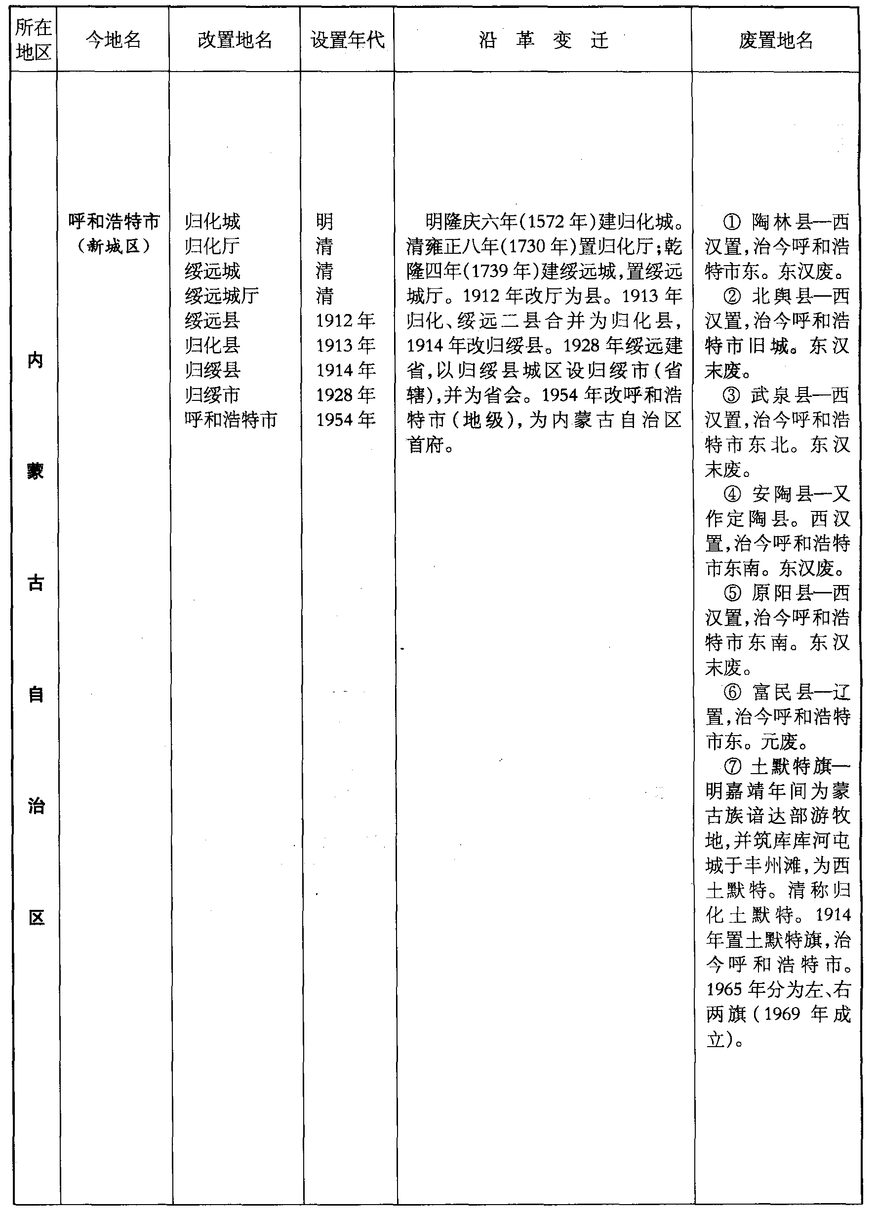 明隆庆六年(1572年)建归化城。清雍正八年(1730年)置归化厅;乾隆四年(1739年)建绥远城,置绥远城厅。1912年改厅为县。1913年归化、绥远二县合并为归化县,1914年改归绥县。1928年绥远建省,以归绥县城区设归绥市(省辖),并为省会。1954年改呼和浩特市(地级),为内蒙古自治区首府。