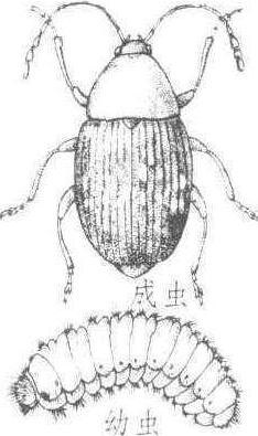 释义 | 咖啡豆象coffee bean weevilAraecerus fasciculatusDe-Geer,昆虫纲,鞘翅目,长角象科。分布于亚热带和热带地区;除华北、东北、新疆、西藏外的各省区均有分布。在田间为害可可、咖啡、豆蔻的种子;在仓内为害咖啡豆、棉籽、玉米、酒曲和植物性药材。成虫体长3~4.5 mm,椭圆形,褐色,密布刻点和卧毛;触角1~8节细长丝状,褐色,9~11节扁平膨大成三角形,黑色;翅鞘上各有5~7个略呈方形的灰色斑点;腹末第2节背板中央呈沟状凹陷。末龄幼虫体长4.5~6mm,乳白色,有皱纹,多毛,胸足退化。中国一年发生3~4代,以幼虫在被害物内越冬。成虫善飞能跳,在仓内和田间均能繁殖,卵产在种子或粮粒内。宜做好隔离工作,防止成虫飞入仓内产卵;可用熏蒸药剂防治。 咖啡豆象 |