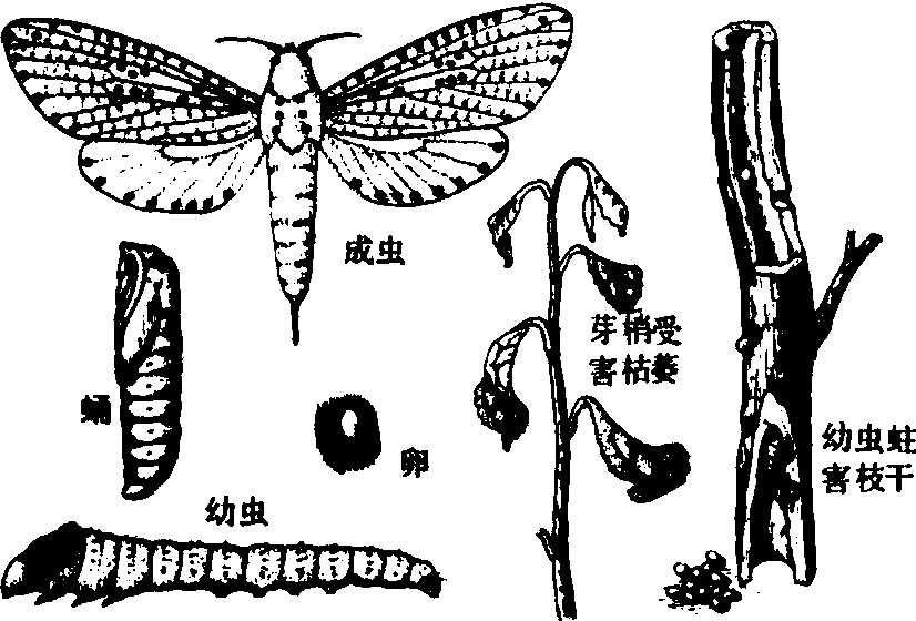 释义 | 咖啡豹蠹蛾coffee carpenter moth茶树枝干钻蛀害虫之一, 又名咖啡木蠹蛾、茶枝木蠹蛾, 属鳞翅目木蠹蛾科, 学名为Zeuzera coffeaeNietner。 咖啡豹蠹蛾 生活习性 一年发生1~2代, 以幼虫在枝干内越冬, 以老熟幼虫越冬的次年发生2代。安徽越冬幼虫翌年4月间继续活动为害,5月上中旬陆续化蛹, 5月下旬羽化,6月中下旬成虫盛发; 第2代成虫于8、9月发生。江西南昌第 1、2 代幼虫分别于5月中下旬及9、10月孵化, 5月上旬至6月上旬, 8月下旬至11月中旬成虫羽化。成虫多在夜间活动, 卵产于枝梢上, 每处1粒, 孵化后蛀入梢内为害, 向下蛀成虫道, 直达枝干基部, 枝干外常有3~5个排泄孔, 零乱排列不齐, 排泄孔外多粒状虫粪。一头幼虫常可蛀害3~5个枝干。幼虫老熟后, 先在枝上咬一羽化孔, 并吐丝封孔, 然后在虫道内作茧化蛹, 蛹经20天, 蛹体蠕动半露于孔外, 羽化后飞出交尾产卵。 防治 8、9月检查枯萎细枝, 自最下一个排泄孔下方剪除茶枝, 冬春季从近地面处剪去枯萎虫枝,剪下的有虫茶枝及时清出茶园处理。成虫盛发期可在虫口密度较大的茶园里晚间灯火诱蛾。 |