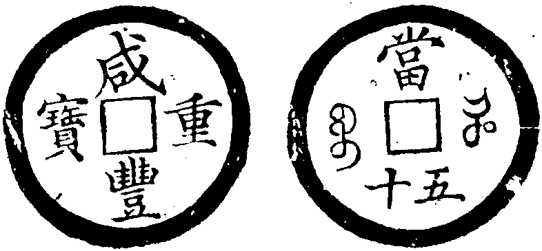释义 | 古代名物 > 貨幣類 > 銅鐵錢部 > 清 > 咸豐重寳 咸豐重寳 xiánfēngzhòngbǎo 清文宗咸豐年間(公元1851—1861年)鑄。面文真書,直讀。背滿文記局,漢文記值,回疆諸錢滿、回合文記局。可見“寳泉”、“寳源”及各地局名二十餘種。記值以“當十”、“當五十”兩種爲常見,其次爲“當五”,少數局錢有“當四”、“當八”、“當二十”、“當三十”、“當四十”字樣,亦有銘作“拾文”、“一十”、“二十”、“五十”、“百”及“一百”者。又,寳福局錢或兼記重,其文自當五錢之“二錢五分”至當百錢之“計重五兩”不等。因係各局所鑄,加之分量時變,故幣值相同者大小多殊,甚至幣值不等者輕重倒置。如當五十錢,其小者徑僅三·六厘米,重十餘克,而大者有徑達六·四厘米,重逾八十克者,超過不少當百錢。近年江蘇江陰更出寳蘇特大“咸豐重寳”,徑二十二厘米,重二·九公斤,爲咸豐第一大錢。光緒《順天府志》:“咸豐三年,軍旅數起,餉需支絀,東南道路梗阻,滇銅不至,刑部尚書周祖培、大理寺卿恒春,御史蔡紹洛先後條陳錢法,請改鑄大錢以充度支……五月,先鑄當十錢一種,文曰咸豐重寳,重六錢,與制錢相輔行。八月,增鑄當五十錢一種,重一兩八錢。”參閱清·鮑康《大泉圖録》、張絅伯《咸豐大錢考》。 咸豐重寳 |