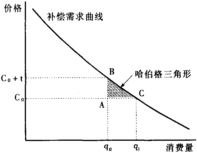 哈伯格(Arnold Carl Harberger),1924年生,美国芝加哥大学古斯塔夫斯·F和安·M·斯威夫特讲座杰出教授。哈伯格三角形与税收的超重损失有密切联系,它测度着税收引起的效率损失。如图所示,假定生产香烟的成本是C0,税收t使得每包香烟的价格从C0上升到(C0+t)。同时假定人们消费的香烟数量,在征税时为q0包,在香烟税取消(而代之以总额税,这两种税所引起人们生活的变化是一样的)时为q1包。这样,我们可以在图中划出这种假设下的补偿需求曲线。图中以ABC代表的面积即哈伯格三角形。它处于补偿需求曲线之下、C0之上,位于有香烟税时的产量之间。哈伯格不仅运用这一三角形去测度税收扭曲所产生的效率损失,而且也测度其他效率损失,如垄断等造成的损失。