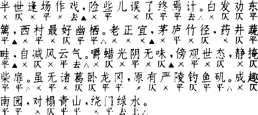 释义 | 哨遍 哨遍词牌名。又名《稍遍》。始见于苏轼《东坡词》。双调二百零三字,上阕五平韵四仄韵,下阕五平韵八仄韵。然其体近似散文,句读平仄往往不拘。又曲牌名。南北曲均入般涉调,字句格律与词牌异。参见“常用曲谱”类。 ☚ 宝鼎现 戚氏 ☛ 哨遍 哨遍马致远 散套 ![]() 全曲十六句:6▲,7△。5▲,7△。3▲,4,4▲,5△。6▲,4,4△。7,7△。4,4,4△。第三句可作七字句,或六字折腰句。第四句多作上三下四式七字句。第六、七句对。第十、十 一句对。第十二、十三句对。末三句鼎足对,或只对两句。睢景臣《高祖还乡》套,减第九、十、十一句,仅见。石君宝《紫云亭》第八句不叶韵,改在第九句叶韵断句。散套首牌,剧套联入套内。有幺篇换头,剧套不用,散套可用可不用。亦入〔正宫〕、〔中吕〕,只用在剧套中。与词牌小异。同诸宫调。南〔般涉调〕慢词用宋词。 ☚ 般涉调 耍孩儿 ☛ 哨遍 哨遍或作《稍遍》。见宋苏轼《东坡乐府》。其小序云“乃取《归去来辞》,稍加檃括,使就声律”,是为苏轼所创。汲古阁本《东坡词》于《稍遍》后附小注:“其词盖世所谓‘般瞻’之《稍遍》也。‘般瞻’,龟兹语也,华言为五声,盖羽声也,于五音之次为第五。今世作‘般涉’,误矣。《稍遍》三叠,每叠加促字,当为‘稍’,读去声。世作‘哨’,或作‘涉’,皆非是。”然各本仍多作《哨遍》。《词律》卷二○、《词谱》卷三九皆以苏轼所作(为米折腰)为正体,双调,二百零三字,上片十七句五仄韵四平韵,下片二十句五平韵七仄韵,同部参差错叶。《词律》云“此调长而多讹”,《词谱》云“其体颇近散文”。《词谱》列别体八种,其中《花草粹编》无名氏所作仅一百六十字,馀皆略有参差,用韵、句法或句读有异,汪莘一首平仄各韵,不用三声叶。 ☚ 晕眉山 唤春愁 ☛ 哨遍 哨遍词牌名。一作稍遍。苏轼创制。双调。苏轼《哨遍》词序:“陶渊明赋《归去来》,有其词而无其声,余既治东坡,筑雪堂于上,人人俱笑其陋,独鄱阳董毅夫过而悦之,有卜邻之意。乃取《归去来辞》稍加隐栝,使就声律,以遗毅夫。使家僮歌之,时相从于东坡,释耒而和之,扣牛角而为之节,不亦乐乎?”见苏轼《东坡乐府》。 ☚ 夜半乐 莺啼序 ☛ 哨遍 哨遍词牌名。一作《稍遍》。苏轼创制。双调。苏轼《哨遍》词序:“陶渊明赋《归去来》,有其词而无其声,余既治东坡,筑雪堂于上,人人俱笑其陋,独鄱阳董毅夫过而悦之,有卜邻之意。乃取《归去来辞》稍加隐栝,使就声律,以遗毅夫。使家僮歌之,时相从于东坡,释来而和之,扣牛角而为之节,不亦乐乎?”见苏轼《东坡乐府》。 ☚ 西河 解连环 ☛ |
