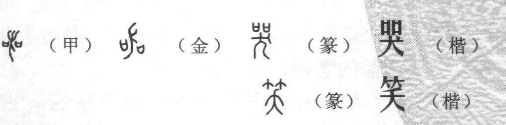 释义 | 哭笑 风吹草动池水绉 哭笑 风吹草动池水绉(甲) (篆) 笑是人的所有表情中最讨人喜欢的版面。在现实生活中,哭与笑表现的是截然相反的两种心境。其实,哭时笑了的,才是真哭; 同样道理,笑时哭了的,才是真笑,生活原本就是这样的逼真。 哭笑,无疑是个热门话题,生活中常会要碰到的。 哭笑是自然的流露,它不过是风吹草动掀翻了一池清水。 哭笑是自然造化和人类进化的结果。因此,哭笑是自然的流露,哭笑不得才是最尴尬的。 “哭”和“笑”是大自然赐给灵长类脸部的一技之长。人有了此长,才使得脸这个盘子不断变换着角色,忙个不停。时而狂飙四起,怒吼哭泣; 时而彩云高飞,笑逐颜开。哭笑虽是情绪的两个极端,然而距离却不很远,乐极生悲,否极泰来,大约就占据了人生的许多时空。 看见这个“哭”字就想哭。眼珠和泪珠,夺框而去,两口枯井下边又卧着一只“犬”,一副凄惨当哭的景象。但这一“哭”造型较晚,我们还是先看甲骨文时的“哭”。 甲骨文的 “哭”,是个带有象形韵味的会意字。一个人散乱着头发,头部只突出了“哭”的两只有框无泪的眼睛,不仅显得十分浪漫,还有某些夸张。甲骨文时是将“哭”归在噩、丧、桑一类,这大概因为“噩、丧、桑、哭”是一个意域系列的缘故吧。 金文的 “哭” ( ![]() ![]() 生活中 “哭” 与 “器” 没有内在联系,清朝,同治皇帝小儿顽皮,他的老师李洪藻被他气哭了,同治正读《论语·学而》:“君子不器”,这时他用手将“器”的下部遮住,喊老师:“老师,你看 ‘君子不哭’。”同治小儿竟然用“器”字戏谑他的老师,但谑而不虐。 古人对“哭”确是作了一番实地考察的。古时以泪代哭,后来人们哭的形式多样起来,文字就跟在后边为它圆场。有声有泪谓之泣; 有泪无声谓之哭; 声泪俱下谓之涕;涕泪双流谓之潸; 无泪有声谓之啕; 有声、有泪、有调谓之歌。长歌当哭,儿时随母亲去舅家,母亲骑在驴背上,沿着羊肠小蹊得走一整天,临到时,母亲总是要用沉重的放声来呼唤她故去的父母。母亲凄楚的声调和悲哀的咏诉,足以泛起我的一阵心酸。这时我就像小狗一样跟在母亲后面,泪眼矇眬,大概眼珠和泪珠也已夺框而走了。可我是有泪无声,实在是诠释了一个 “哭” 字呢。 古时有哭墓的习俗,到墓地去哭,往往都哭得相当悲壮。唐朝时,臣民有冤可到太宗墓去哭诉,《唐诗记事》就有李洞诗句:“公道此时如不得,昭陵恸哭一生休”。陆游《遣怀》也有“积愤有时歌易水,孤忠无路哭昭陵”的诗句。 传说有个人半夜去敲拆字先生的门,问家人的疾病,刚一开口,隔壁的狗叫了一声。拆字先生一挥手,“不用问了,快去回去准备后事。”原来问字人一张口,加上狗吠就成了“哭”,丧则哭。现在的“哭”,没有了古人“哭”得那样纯粹,似乎“哭”不是一种生理现象,而成了某些人简单的谋生与心理作用。哭,成全了许多人的既定目标。 《说文》: “哭, 哀声也。 从吅, 从狱省声。”“哀声也不确”; “狱省声”有误。许慎把哭字说成“狱省声”连他的忠实信奉者清代文字学家段玉裁也不以为然。他说“哭犬嗥而移以言人,可推而知也”。 “笑”,是个晚出字,甲骨文、金文没有。甲骨文、金文没有,不是说那个时代没有笑,而是用其它字符来代替。 甲骨文时, 高兴、 喜悦用 “㕣 ”, 喜笑用 “喜”;后来微笑用“哂”; 笑出声来用“嘻”。 同样,看见这个 “笑” 字,就想笑。不但想笑,还能笑出声来: 笑眯眯的双眼弥成一条缝,面似靴皮,布满了鱼尾纹,一副“土地爷”式的和善可亲的面孔。 “笑”,甲骨文、金文没有,连 《说文》 也没有拾掇进来,可见那个时代的 “笑”很少,或可有可无,即使偶尔有 “笑”,也是拿 “喜” 替代的。然而,怎一个“喜”字了得? 笑有奸笑、憨笑,有狂笑、冷笑,有微笑、嬉笑,有傻笑、讪笑,有苦笑、狞笑,有嘲笑、讥笑,有取笑、耍笑等等,“喜” 怎生将面部这些多变的表情分得出来?于是便造出了这个“笑”字来。 小篆的 “笑” ( ![]() “笑”还有一解: 以“竹” 类人的笑眼,人笑时前仰后合,或边舞边笑而已。“笑”,实乃一幅“朗笑图”。 竹,虚心有节,长青挺直,筛风弄月,潇洒一生,青华其外,澹泊其中,不作媚世之态,是传情的造物,我以为“竹得风,其体夭屈如人之笑”的解释也无不可。可是,竹往往充当悲凉的角色。郑板桥的“衙哉卧听萧萧竹,疑似民间疾苦声”,“竹”给政治资源拥有者就传递了一个“民间疾苦”的声音,当林黛玉“香魂一缕随风散,愁绪三更入梦遥”的时候,“惟有竹梢风动,月影移墙,好不凄凉冷淡”,可见造字者是取竹之“形”,而并非取竹之“影”的。是李阳冰通过竹的“夭屈如人之笑”,将笑声带到了人间,我想这造 “笑” 的先生,不是文学家也是诗人。 有人为弥勒佛画像: “大肚能容,容天下难容之事;开口常笑,笑世上可笑之人”。这是个高难度的坎儿,我是越不过去的,量许多人也很难办到。有时也哈哈大笑,那种愉快的心情在笑声中得到了尽情的发挥,可是如笑中的“夭”,很快就被蒸发了,笑声中的人和笑声中的世界都十分可爱,可于我们不久,也不多。 笑,一般都具有魅力,白居易 《长恨歌》: “回眸一笑百媚生,六宫粉黛无颜色”。我们在办完自认为有点意义的事情以后,往往也有会心地一笑,这笑是对自己的肯定,也表示对现实的满足,同样也是具有魅力的。