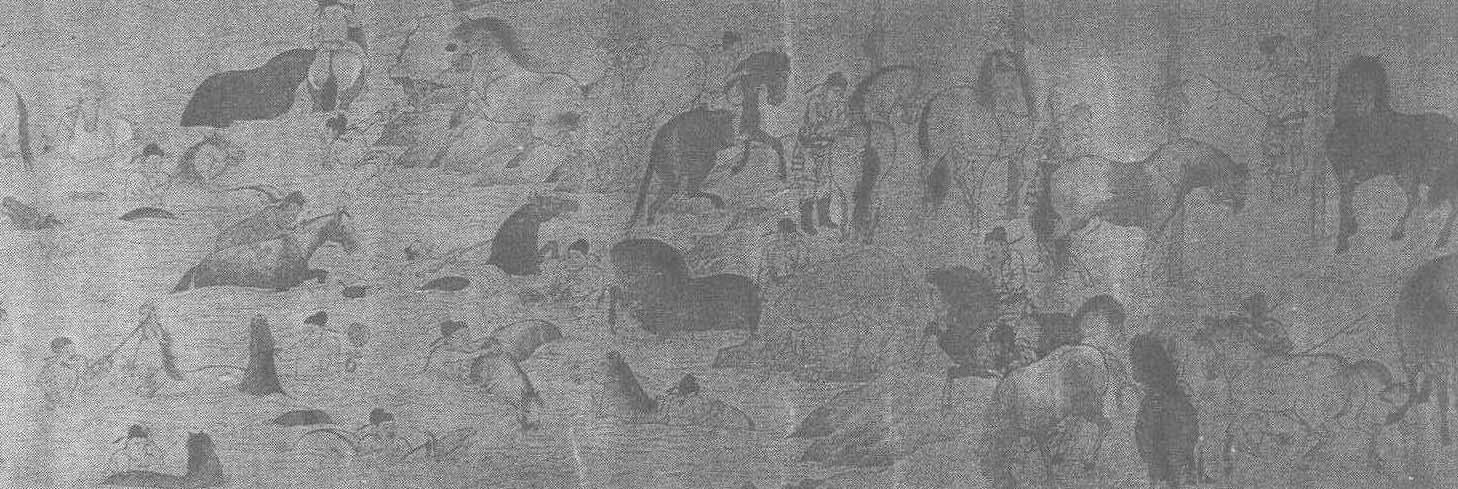 唐。佚名。绢本设色。纵26.7厘米,横302.1厘米。北京故宫博物院藏。图中描绘圉人洗浴、训练一群骏马的情形。画面背景是一块平展宽阔的驯马场,一道溪流直穿而过。右岸几个圉人将马系在高直的木柱上,为它们涮洗。另一些人则把马带到河边,水中十几个人打着赤膊给马洗澡。马的神情不一,有的在岸边畏水不前,有的在河中腾跃欢叫,还有的驯顺安静,听任摆布。左岸空场上,马群没有圉人拘管,有的追逐奔竞,有的并步缓行,有的踢跳撕咬,有的磨颈亲昵。昂首鸣叫的,低头啮草的,就地打滚的,安卧歇乏的,姿态种种,令人眼花缭乱。卷尾圉人们将马的前后蹄用一定长度的绳子联结起来,训练马步。有的人正在试骑,还有的人则在切铡干草,向马槽里添加饲料。一只平时供人玩耍的小猴被拴在一边,呆呆地望着大家忙碌。驯好的马被拴在木柱上,有人安辔,有人系尾,有人配鞍挂镫,将它们装扮起来。此图笔法劲利,色彩明快,兼施晕染。马匹造型准确,生动传神,肌骨圆实而多力,具有很高的艺术水平。《石渠宝笈续编》著录。