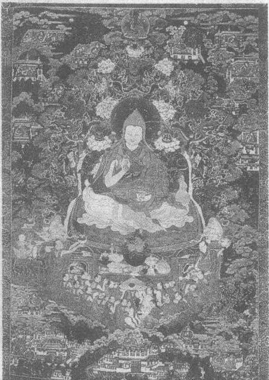 清。布画,设色。纵98厘米,横64厘米。西藏自治区拉萨市布达拉宫藏。此幅唐卡描绘的是五世达赖讲经画像。五世达赖名阿旺罗桑嘉措(公元1617—1682年),生于山南穷结地方。明天启二年(公元1622年)时,他才六岁,被三大寺僧众迎入哲蚌寺供养。公元1625年拜四世班禅为师,受沙弥戒,1637年受比五戒。明崇祯十五年(公元1642年),推翻西藏地方统治者噶玛噶举派藏巴汉政权,建立了甘丹颇章地方政权。清顺治九年(公元1652年)进京朝觐,次年返藏途中被封为“西天大善自在佛所领天下释教普道瓦赤喇帕喇达赖喇嘛”,并赐以金册金印。从此达赖喇嘛的名号正式固定下来,它在西藏的地位由中央政府承认并确立。晚年从事著述,著有《相性新释》、《西藏王臣记》、《菩提道次第论讲义》、《引导大悲次第论》等三十余卷,清康熙二十一年(公元1682年)在布达拉宫圆寂,第斯桑结嘉措为其修建金塔安葬遗体。这幅唐卡描绘了身着法衣、脑后有光环的达赖五世,手执法器,正襟危坐,给弟子们讲经学的情景。达赖五世表情严肃,面呈沉思之态。下面洗耳恭听的是达赖的忠实信徒。他们双手合十,跪在达赖面前,十分虔诚。有二、三听众面有疑问,似与邻座探讨。在达赖左右,有二人手捧香炉站在一旁恭候;脚边有两只大象,呈半跪姿态,随时听令。其四周屡屡再现的风格各异、形式不一的寺院、宫殿之中,达赖五世拜师、受戒、传经讲学的画面,起到了点化、突出中心人物的作用。