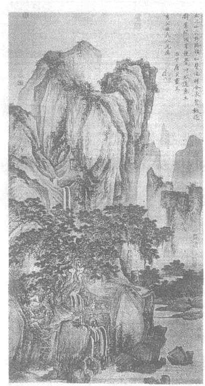 绢本,淡设色。纵194.5厘米、横102.8厘米。现藏台北故宫博物院。这是一幅全景式山水。高松峻岭,山路盘旋,小桥飞架,山坳间流泉三叠下注深壑,一长者立桥头静观,书童抱琴随后。画法仿李唐一派,劲笔长皴,略施晕染,学李而不显露 。山体块面分明,整体感强,长松、丛树刻画精致,笔路清晰,与山体对比呼应。一反谨细画风,更接近乃师周臣。画面自题: “女几山前野路横,松声偏解合泉声。试从静里闲倾耳 ,便觉冲然道气生。治下唐寅画呈李父母大人先生。”
