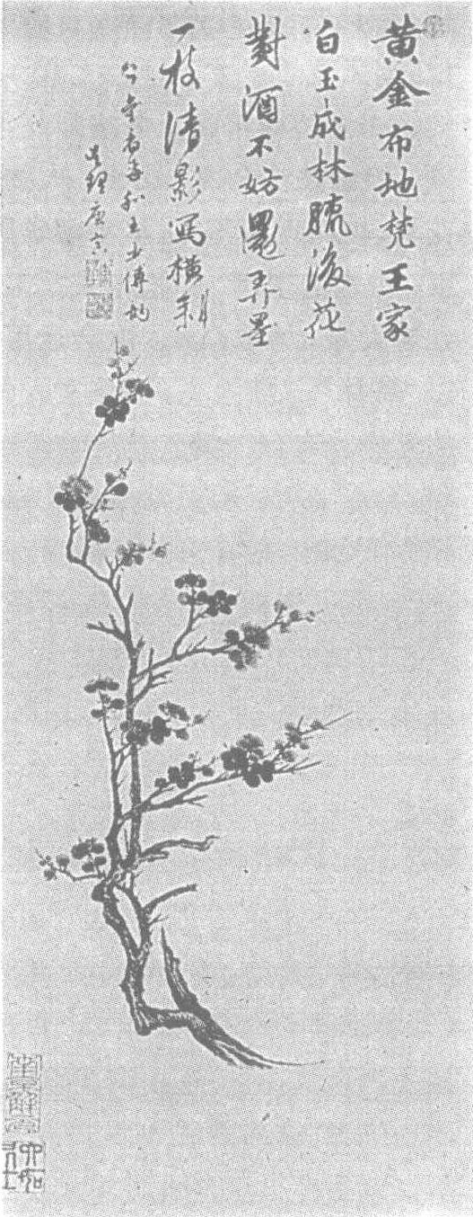 释义 | 唐寅梅花图轴 唐寅梅花图轴明。唐寅(见《唐寅湖山一览图轴》条目)绘。纸本墨笔。纵59.9厘米,横36.1厘米。北京故宫博物院藏。此图水墨画一株折枝梅花。枝干用笔劲健,墨色浓重。梅花盛开,芬芳吐艳,形象秀美,多姿多彩。花瓣用水墨点成,浓淡相宜,颇有质感层次。形态生动,简洁清新,给人以清新爽丽之感。幅上自题七绝一首:“黄金布地梵王家,白玉成林蜡后花;对酒不妨还弄墨,一枝清影写横斜。”并识“公堂看梅和王少传韵。吴趋唐寅。”钤〈吴趋〉、〈唐居士〉、 〈唐寅私印〉,左下角钤〈南京解元〉、〈六如居士〉印。 ☚ 沈周仿董巨山水图轴 唐寅孟蜀宫妓图轴 ☛ |