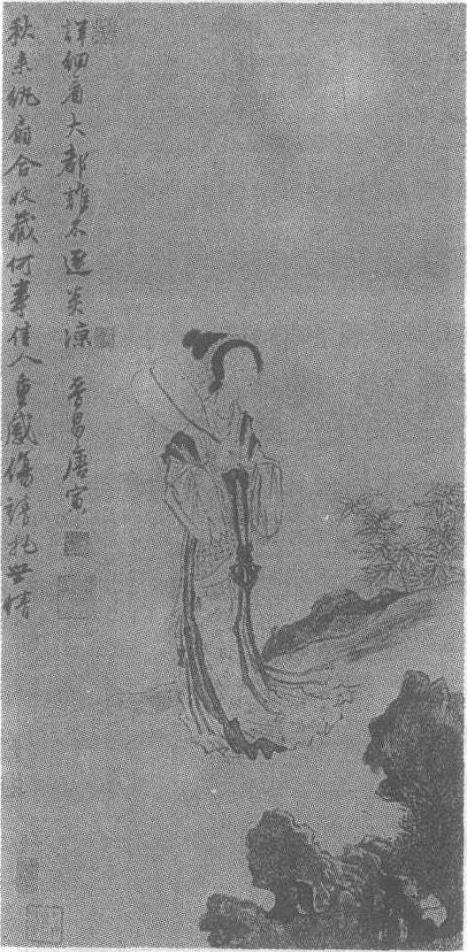释义 | 唐寅秋风纨扇图轴 唐寅秋风纨扇图轴明。唐寅(见《唐寅湖山一览图轴》条目)绘。纸本墨笔。纵77.1厘米,横39.3厘米。上海博物馆藏。此图画一仕女,手持纨扇伫立于庭院中,容貌秀丽,双眸凝视前方,一副若有所思的神态。高耸的发髻,青丝如墨。背景简括,画坡石一角和疏落的细竹。左上角题诗:“秋来纨扇合收藏,何事佳人重感伤,请把世情详细看,大都谁不逐炎凉。”诗画互相映衬,表现了仕女从一柄夏天始用,秋天收藏的小小纨扇,联想到自己也与这纨扇命运一样。青春难驻,世态炎凉,禁不住惆怅伤感。突出了“秋风见弃,触目伤情”的主题。此图充满了作者对弱小者的同情。全画用白描法,墨色浓淡适宜,笔墨流动奔放,挥洒自如,极富韵律感。衣纹转笔方劲,线描遒劲飞舞,衣服线条起伏很大,点出“秋风”之意。 ☚ 唐寅渡头帘影图轴 文徵明石湖清胜图卷 ☛ |