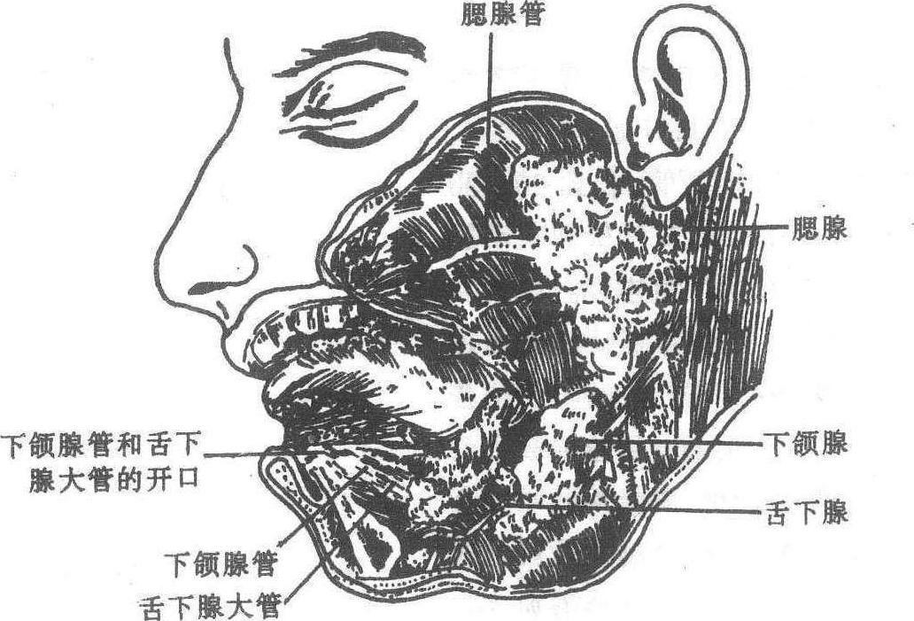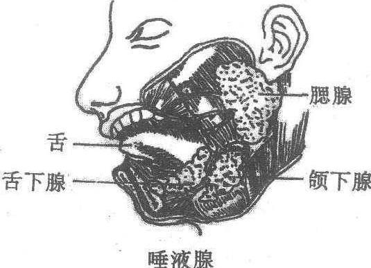 另见:口腔 分泌 湿润 ☚ 唾、涕、泪、血 鼻涕 ☛ 唾液 唾液唾液主要是由三对大唾液腺——下颌腺、腮腺和舌下腺分泌的(见图1.7-3)。此外,在口腔粘膜还有很多小唾液腺,可分泌小量唾液。正常人每日的唾液分泌量约为1—1.5升。唾液近乎中性,其中水份约占99%,所含的有机物中,最重要的有唾液淀粉酶和粘蛋白等,无机物有Na+、K+、Cl-、HCO-3等。唾液淀粉酶经唾液中的Cl-激活后,可将淀粉水解为糊精和麦芽糖,其发挥作用的最适pH为6.8,食物在口腔内停留的时间很短,但食团入胃后唾液淀粉酶可继续发挥作用、直到胃液浸入食团使pH降到4.0时,其作用才停止。唾液还有许多其他重要作用: ❶唾液可作为溶剂使营养成分溶解,刺激味蕾而产生味觉; ❷唾液中的水分和粘液可使食物稀释、滑润,并形成食团而便于吞咽; ❸唾液使口腔保持湿润,从而使唇舌运动自如便于说话; ❹唾液能清除口腔中的食物残渣。当有害物质进入口腔时,可引起唾液大量分泌而将其冲淡、中和,并将其从粘膜上清洗掉; ❺唾液中含有溶菌酶和硫氰离子,因而有一定杀菌作用。唾液分泌受神经系统调节。进食时,食物对口腔的机械和化学刺激可反射性地引起唾液分泌,称为非条件反射性调节。看到食物或闻到食物的气味以及进食环境或谈论和想象食物也可引起唾液分泌,这称为条件反射性调节。成人的唾液分泌通常都包括条件反射和非条件反射两种成分。