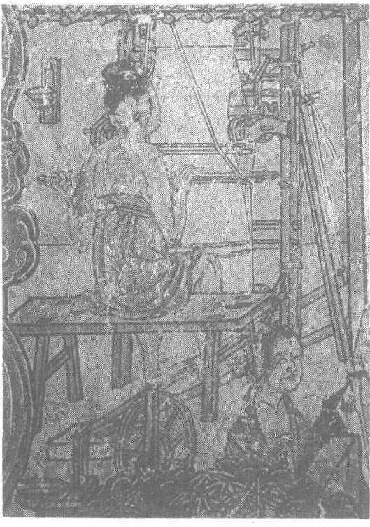 宋。纵27厘米,横19厘米。山西省高平县开化寺大雄宝殿西壁中部壁画。这组壁画表现了善友太子故事中的观渔、观耕、观织等场景,此为其中观织一景。在简朴的农舍内,一织女坐在长凳上,面前摆一台织布机。织女上身裸露,腰系红裙,背对画面,手搬纬牌,脚踏折板,动作极为熟练灵巧。机架上有已经织成的很长的一段白布。屋内设施简陋,仅在木托架上置一白碗做灯盏,表明她夜间也须劳作。小院墙外立一行人,以善友太子为中心,在向院里的房舍中观望。院墙里几位平民对这一行人吃惊好奇,有的甚至爬墙向外探望。此图的情景极为生活化,令人感到乡村农舍的气息扑面而来。织女所用织布机现在晋东南地区仍可见到。