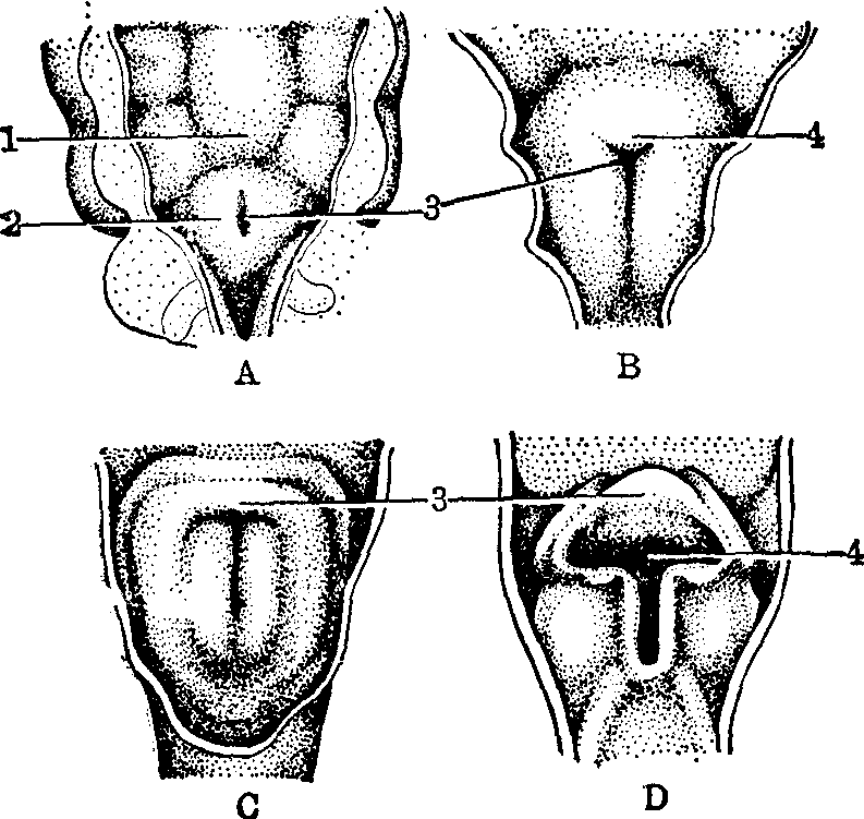 1.鳃下隆突 2.杓状膨突 3.喉口 4.会厌