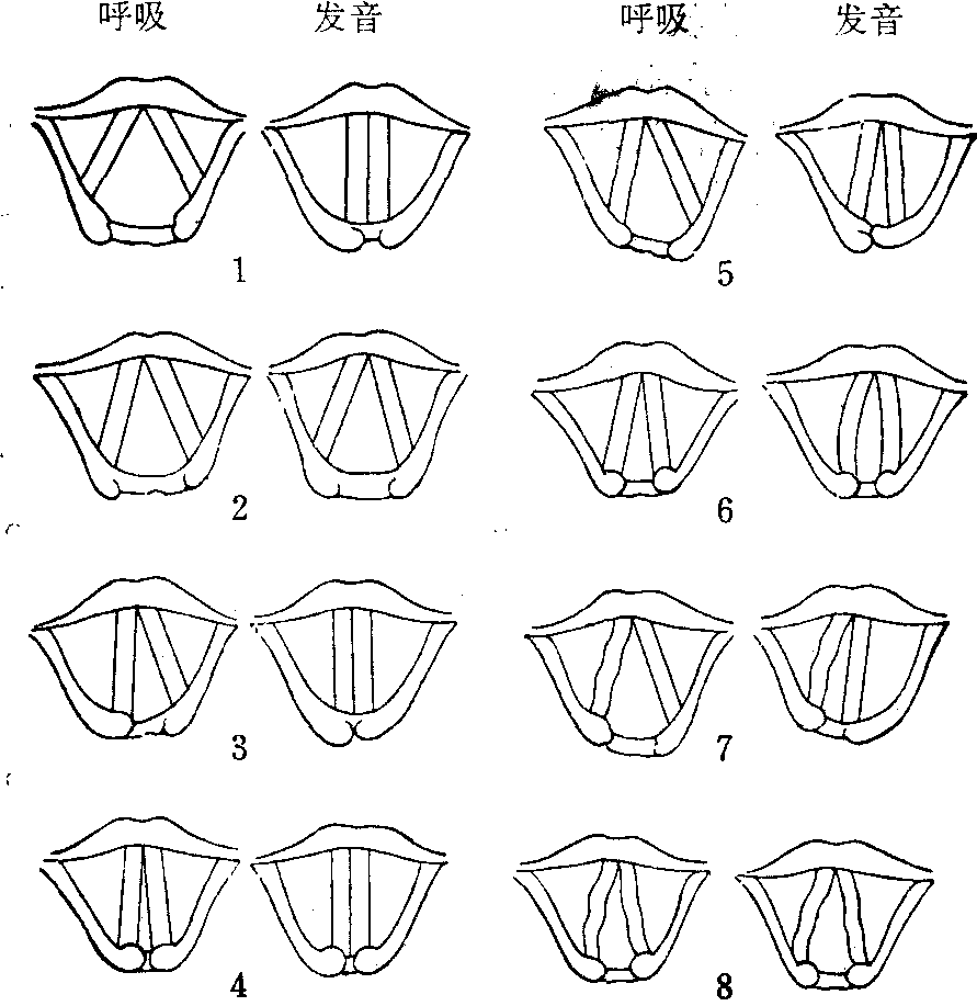 1. 正常喉部 2. 两侧内收肌瘫痪 3. 单侧外展肌瘫痪 4. 两侧外展肌瘫痪 5. 单侧返神经全瘫 6.两侧返神经全瘫 7. 单侧返神经及喉上神经瘫痪 8. 两侧返神经及喉上神经瘫痪