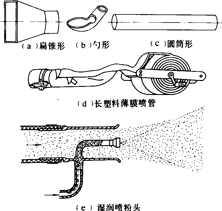 喷粉头dust nozzle将携带粉剂的气流导向目标物的装置。是各种喷粉机具上的重要工作部件。它可分为扁锥形、勺形、扇形、直管形、文管形、长塑料薄膜管等形式(图1)。
