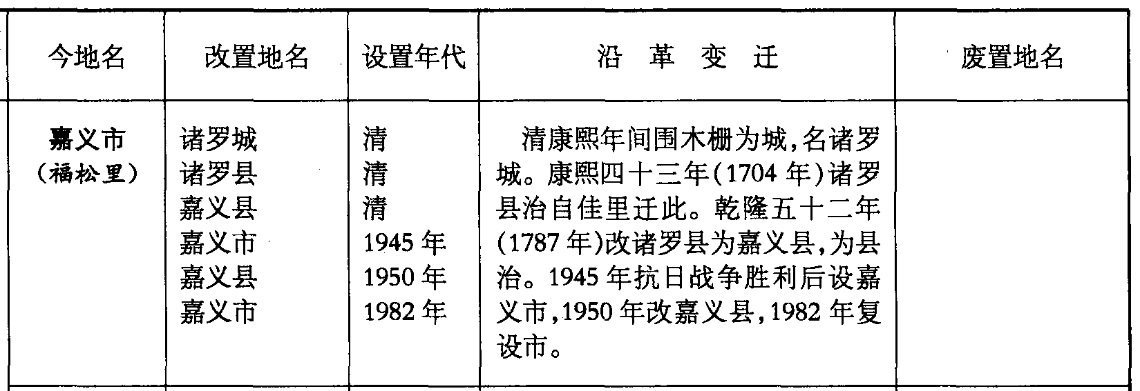 嘉义市(福松里)诸罗城诸罗县嘉义县嘉义市嘉义县嘉义市清清清1945年1950年1982年清康熙年间围木栅为城,名诸罗城。康熙四十三年(1704年)诸罗县治自佳里迁此。乾隆五十二年(1787年)改诸罗县为嘉义县,为县治。1945年抗日战争胜利后设嘉义市,1950年改嘉义县,1982年复设市。