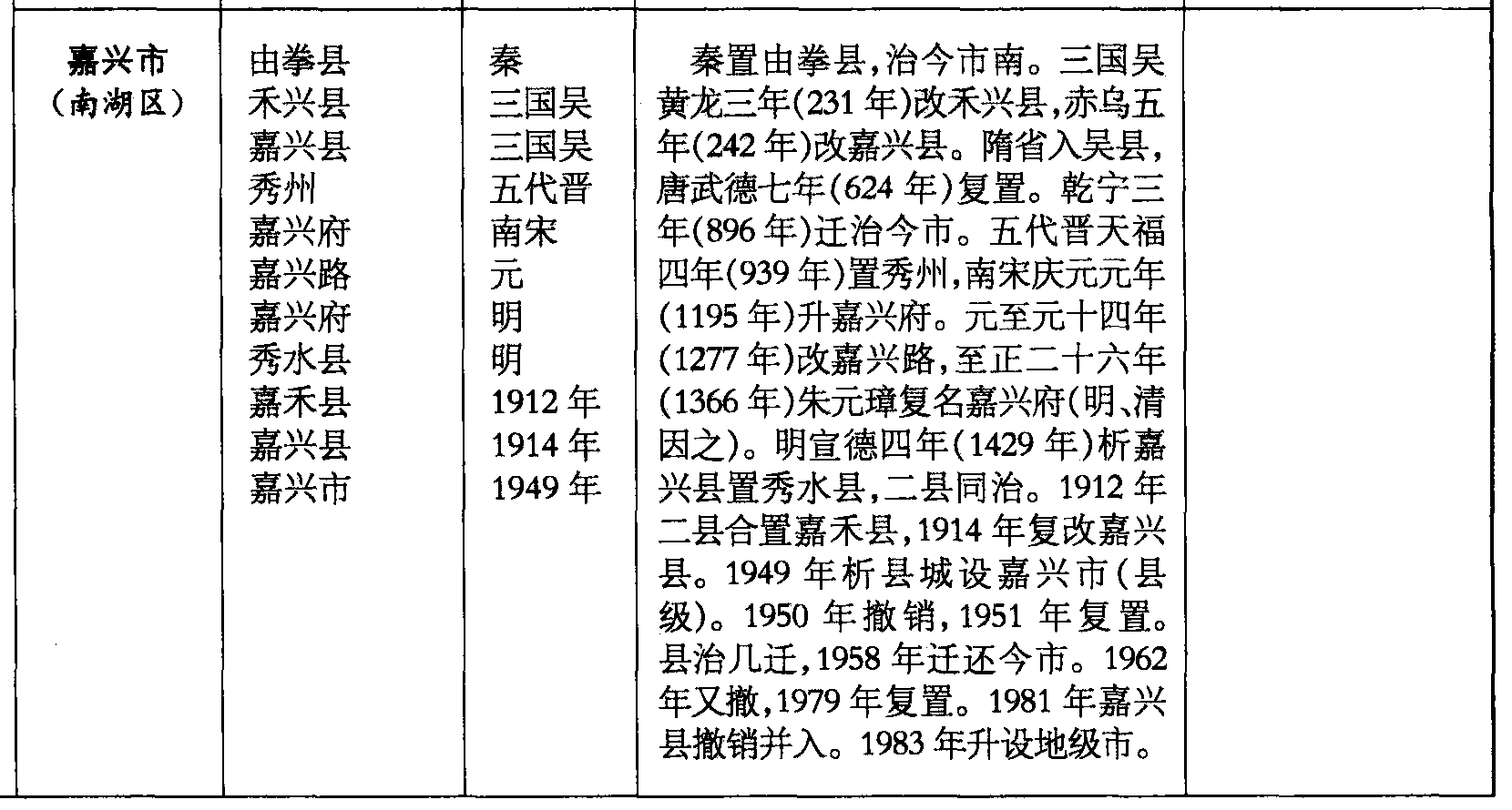 秦置由拳县,治今市南。三国吴黄龙三年(231年)改禾兴县,赤乌五年(242年)改嘉兴县。隋省入吴县,唐武德七年(624年)复置。乾宁三年(896年)迁治今市。五代晋天福四年(939年)置秀州,南宋庆元元年(1195年)升嘉兴府。元至元十四年(1277年)改嘉兴路,至正二十六年(1366年)朱元璋复名嘉兴府(明、清因之)。明宣德四年(1429年)析嘉兴县置秀水县,二县同治。1912年二县合置嘉禾县,1914年复改嘉兴县。1949年析县城设嘉兴市(县级)。1950年撤销,1951年复置。县治几迁,1958年迁还今市。1962年又撤,1979年复置。1981年嘉兴县撤销并入。1983年升设地级市。