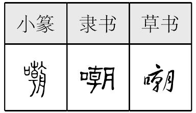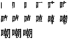 ❹自我解嘲|冷讥热嘲|热唱冷嘲 嘲 金文; 篆cháo[口(意符)+朝(聲符)→嘲(《説文新詂》:“嘲,謔也。從口,朝聲。《漢書》通用啁。”嘲:譏笑,拿人取笑〈嘲笑〉。)] [清] 曹雪芹《紅樓夢》(第七回):“那尤氏一見了鳳姐,必先嘲笑一陣。” 嘲*(15画) ❶cháo ❷zhāo