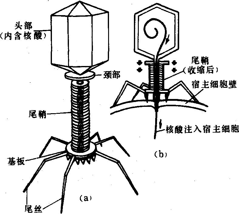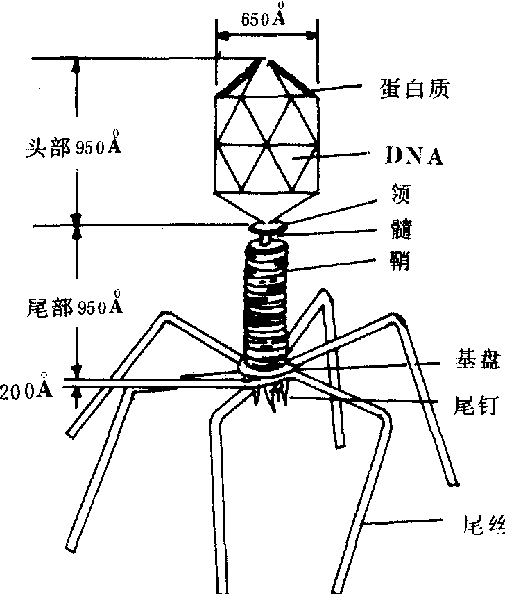 释义 | 噬菌体shì jūn tǐ病毒的一类。1958年《新知识词典》:“噬菌体: 又称嗜菌体。是一种类似过滤性病毒的微生物,因能溶化消灭细菌而得名。” 噬菌体bacteriophage一类感染微生物的病毒。它们中极大多数感染细菌,少数感染放线菌等其他原核微生物。感染的结果导致菌体破坏(溶菌),使菌落和菌苔产生噬斑。噬菌体有各种形态,极大多数呈二十面立体对称,少数呈长丝或近似球状。大肠杆菌T2噬菌体是这类病毒形态的代表,它除了二十面体的头部外,并有能收缩的尾部,尾端有基板、尾丝和尾钉(见图)。其他噬菌体的尾部不一定能收缩,甚至没有尾部。噬菌体的外部是蛋白质衣壳,内部为核酸,少数在衣壳外还有囊膜或其他成分。衣壳的功能是保护核酸和使噬菌体吸附于菌体表面。核酸是噬菌体的遗传物质,多数为双股DNA,少数为单股,还有少数为单股或双股RNA。 噬 菌 体