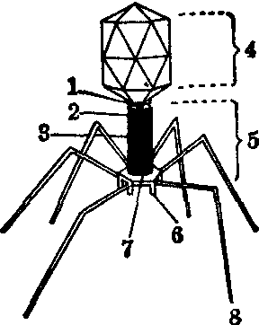T2噬菌体的繁殖过程: 首先通过尾钉和尾丝吸附于易感细菌的特定受体上,接着分泌一种酶,溶解细菌细胞壁,这时尾部的尾鞘收缩,尾管刺入细胞壁和膜,头部的核酸经尾管注入细胞,而衣壳留在细菌细胞外(见图)。随后核酸开始一系列的生物合成活动,包括复制子代核酸、转录信息RNA和转译衣壳蛋白和酶。当各种组分装配成完整的噬菌体后,通过噬菌体的溶菌酶使细菌裂解,噬菌体得以释出(较小的和长丝状的噬菌体在释放时没有溶菌发生,细菌仍然存活,因此不会产生噬斑)。很多噬菌体的特异性很强,只能感染特定的细菌或者菌株,也有些能感染多种细菌。这种能产生大量成熟子代并将细菌细胞裂解的噬菌体称为溶菌型或烈性噬菌体。 另有一些噬菌体在感染细菌后长期处于潜伏状态,它们的基因组与细菌DNA同步复制,不产生衣壳,称为前噬菌体,偶而在个别菌体中形成完整的病毒粒子,引起自发溶菌,称为温和性噬菌体,被它们感染的细菌称为溶原性细菌。溶原性细菌的外观正常,要证实前噬菌体的存在必须用紫外线或H2O2等处理,诱导产生成熟的噬菌体,同时与健康的同种细菌共同培养,观察溶菌现象作为标志。溶原性细菌分布广泛,几乎在每一种细菌和放线菌中都存在。 在溶原性细菌内,前噬菌体可能整合到细菌的DNA中,或形成质粒而单独存在。不管那种形式,都会导致细菌特性的改变,称为噬菌体转变。转变的表现形式多种多样,如:❶能抵抗同种噬菌体的再感染,有时还能抵抗不相关噬菌体的感染。 ❷改变细菌的抗原性,如被某种温和型噬菌体感染后沙门氏菌的O抗原发生了变异。 ❸与白喉棒状杆菌和其他多种细菌的产毒素力有关,只有溶原性细菌菌株才能产生外毒素。 ❹有些因突变而形成的缺陷性噬菌体,它们不再能独立繁殖,但可能产生某些产物,使细菌表现某些特性。如感染菌可分泌细菌素(如大肠菌素),能杀死同种或有关的细菌。 噬菌体常使发酵工业受到损害,如发酵液受噬菌体污染,可使生产菌大量溶菌,导致倒罐,造成重大经济损失,并常污染环境。但噬菌体在实践中有多方面的应用,人和动物的某些细菌性传染病如沙门氏菌病、葡萄球菌病、厌气菌病可以试用噬菌体进行预防和治疗,但其效果不甚满意;细菌和放线菌可用噬菌体加以鉴定和分型;基因工程中以噬菌体作为载体,将克隆的基因整合到它的基因组中,然后导入细菌而使其表达,例如用λ噬菌体制备的cosmid载体;遗传和分子生物学理论研究中,常把噬菌体作为模型而具有重要意义。 噬菌体bacteriophage,phage又称细菌病毒。一类寄生于原核细胞的病毒。已知噬菌体有蝌蚪状,如大肠杆菌T-偶数噬菌体;微球状,如φ×174噬菌体;纤线型,如fi和fd噬菌体。核酸类型有双链DNA、单链DNA、双链RNA和单链RNA。噬菌体只有侵入活的细菌细胞内时才表现出其生物学活性。噬菌体的侵染作用具有严格的寄主专一性,有些噬菌体甚至只对某一菌株有侵染作用。作为一种良好的实验材料,噬菌体在分子生物学、分子遗传学等研究领域都有广泛应用。在工业细菌发酵生产中,噬菌体污染可造成生产上的损失。在医学上,噬菌体可用于鉴别某些细菌、协助诊断或用于防治。 噬菌体 噬菌体shijunti一类病毒,原指细菌病毒,近年来发现真菌、藻类都有噬菌体。噬菌体体积微小,只有在电子显微镜下才能看见,是一种非细胞结构的生命,但只有进入宿主细胞才具有生命特征,并具有寄主专一性,其结构简单,包括蛋白质外壳和包裹在中间的遗传物质—一个单一的核酸分子(DNA或RNA)。在遗传上研究得较清楚的是大肠杆菌的T系噬菌体,其外形一般呈蝌蚪状,只相当于它的寄主大肠杆菌体积的1/1000,每个噬菌体大约是由等量的蛋白质和DNA组成。它的双股DNA分子包在蛋白质外壳里,形成“头部”,“尾部”则由几个不同的部分组成:有领、髓、鞘、基盘、尾钉和尾丝,它们都是由蛋白质组成。就噬菌体与宿主的关系而言,可分为烈性噬菌体和温和噬菌体两大类。烈性噬菌体感染宿主细胞时,例如大肠杆菌的T4噬菌体以其尾部吸附在细菌表面上,然后将其遗传物质DNA注入寄主细胞内,借用寄主的代谢机器复制噬菌体的DNA和合成噬菌体的蛋白质,然后将这些DNA和蛋白质组装成许多新的噬菌体,这时噬菌体通过宿主细胞的裂解而释放出来,以后这些新的子代噬菌体又去感染附近的细菌,并将它们裂解,如此反复,结果便在长满细菌的平板培养基上,形成一个不长细菌的透明斑,即噬菌斑。而温和噬菌体在侵入宿主细胞后,其DNA可以和宿主细胞的染色体整合在一起,并与宿主细胞同步复制,宿主细胞并不裂解。遗传学上经常将噬菌斑的形态和噬菌体的宿主范围作为噬菌体的研究性状,不同的噬菌体所形成的噬菌斑是不同的,噬菌斑有大与小、边缘清晰与模糊之分。就宿主范围说,有些细菌不受噬菌体的吸附,而噬菌体能感染和裂解的细菌菌株也可以不同。噬菌体的基因重组是首先在大肠杆菌噬菌体T2中发现,让两个T2噬菌体的不同突变体同时感染大肠杆菌,两种类型的噬菌体DNA在宿主细胞内可以发生基因重组,从而产生重组类型的子代噬菌体。根据重组噬菌斑数与总噬菌斑数之比,即可算出基因的重组率。通过T2噬菌体的不同品系的杂交试验,现知T2噬菌体的连锁图是环状的。另外,还可以噬菌体为媒介使细菌间的遗传物质得以传递、交换和重组,在这过程中,细菌的一段