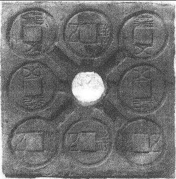 南北朝梁武帝普通年间(约523—527年)。范为砖红色,近正方形,边长8.23、厚0.49厘米。8枚钱模分上中下3行排列,上下各3枚,中行2枚。正中浇铸口直径1.5厘米,口周围8个横铸道连通各钱模,其中4长4短,长者114,短者0.8厘米,排列紧凑。钱模直径2.4,外部0.15,穿边长0.7厘米,左右为阴文反写篆书“五铢”2字。背范钱模穿的四角有四出连外部。这种范可多层相叠进行浇铸,颇精巧合理。旅顺博物馆收藏。