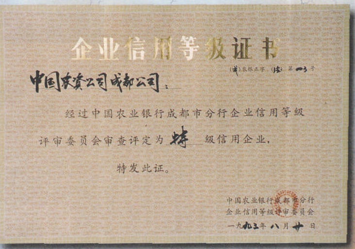 2.1993年被中国农业银行成都市分行评为“特级信用企业”。