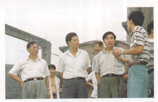 4.四川省交通厅副厅长刘晓峰(左二)、省交通厅航务管理局局长刘龙铸(左三)在乐山肖坝大件码头工地研究港口建设。