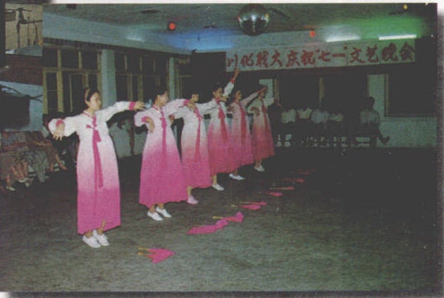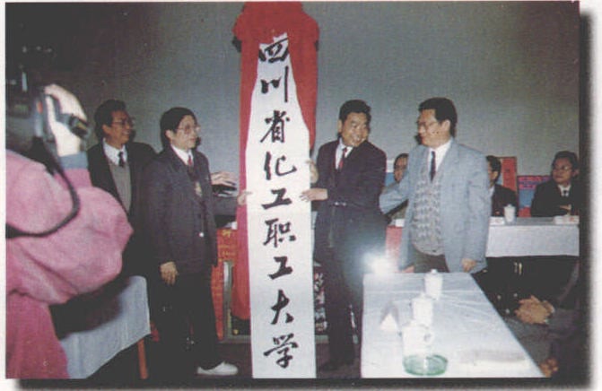 1 四川省化工厅副厅长牟长荣(右一),四川川化集团公司总经理谢木喜(左一)向学样授牌。