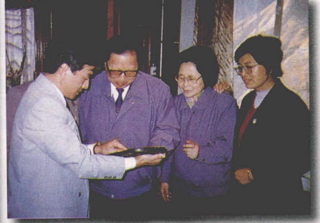 总经理杨天龙(左一)陪同全国人大常委会委员长乔石(左二)鉴赏苴却砚。