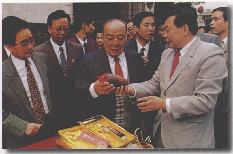 原四川省省长肖秧和泸州市市长唐宁陪同原国家主席杨尚昆视察泸州老窖酒厂 。