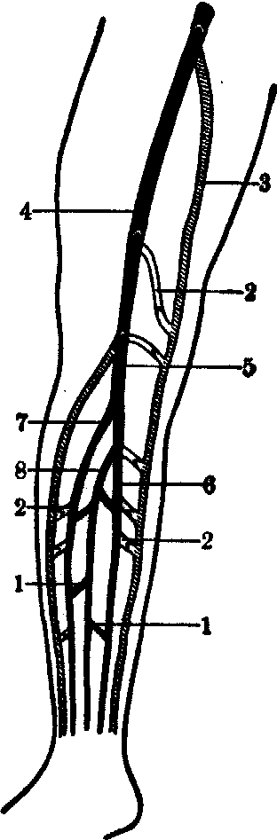 正常造影表现:不论使用结扎穿刺法、骨髓腔穿刺法或功能性上行法造影都能用来显示深静脉。深静脉多与同名动脉伴行,边缘完整,逐渐随上行而管径增粗。深静脉的数量不一,股静脉、腘静脉、腋静脉、锁骨下静脉常为一支,胫前、胫后、尺、桡、肱静脉多为二支或多支。正常情况下浅静脉多半不显影,下肢浅静脉主要有大隐静脉及小隐静脉。大隐静脉起始于足背静脉弓的内侧端,经小腿内侧上升到大腿,转向前方,至腹股沟韧带下方注入股静脉。小隐静脉起于足背静脉弓的外侧端,经小腿后方到腘窝注入腘静脉。上肢浅静脉有头静脉,沿前臂桡侧缘及掌侧上升到锁骨下方注入腋静脉。贵要静脉沿前臂尺侧缘及后背侧上升到上臂中部注入肱静脉。在肘部此两静脉之间有横行相连之肘正中静脉。前臂正中静脉起于掌侧静脉丛,数量不恒定,常有1~4支不等,沿前臂掌侧上行注入肘正中静脉或贵要静脉。在深静脉与浅静脉之间有交通静脉相贯通,交通静脉支不一,但在某些部位比较恒定,如在小腿大致有三组,在踝部后下方、小腿中部和膝关节下方。大腿中部亦有一组。每组交通支可有2~4条,通常为3支(图)。深、浅静脉内都有静脉瓣,多数呈二瓣型,瓣膜游离缘向心或向深部开放,可阻止血流逆流。深静脉瓣膜较多,下肢大约每隔4~5cm有一对,上肢较少,浅静脉亦少。大隐静脉瓣大约为4~15个,平均8个。小隐静脉及上肢浅静脉瓣较少。交通支之静脉瓣都位于深静脉联接处,而与浅静脉相接端无瓣膜。静脉瓣所在处局部膨大,故血管呈竹节状。