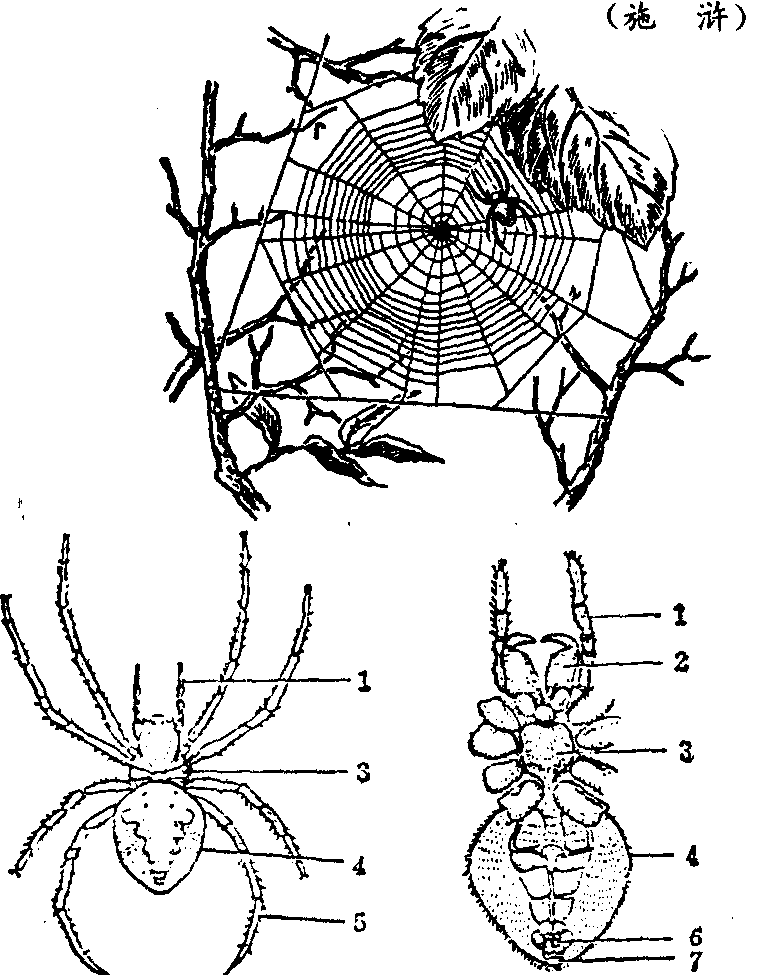 释义 | 园蛛garden spider;Aranea又称圆网蛛。蛛形纲,圆网蛛科。体型大,黑褐色。雄体较小;雌体大,长可达3 cm。体分头胸部和腹部,中间有细腰相连。头胸部有附肢6对,第一对为螯肢,第二对为脚须,在雄性其末端膨大形成交接器,其余4对为步足,足上多刚毛。傍晚时,常在墙角、屋檐、树杈间张网,捕食昆虫。网大,呈车轮状。如十字园蛛 (A.dia-dematus)、大腹园蛛(A.ventricosa)、肥胖园蛛(A.pinguis) 。 园蛛 园蛛yuanzhuAranea无脊椎动物,蛛形纲,园蛛科。在庭院中最常见的为大腹园蛛(Aranea ventrico-sa),体强大,雌蛛体长约3厘米,暗褐色,体分头胸部和腹部。头胸部的背面具有单眼4对。头胸部具有6对附肢,第1对为螯肢,内有毒腺,末端有钩和毒腺孔,用以捕捉食物;第2对为触肢,雄性的触肢具有交配功能;其余4对为步足,上有刚毛,末端有爪,用以爬行。腹部很大,不分节,前端具有1对书肺孔,其下方中央有1个生殖板,盖住生殖孔;腹部后端中央有气门的开孔,为气孔,气门之后有3对纺绩器;腹部末端为肛门。园蛛为肉食性动物,以蛛网捕食。网大型,结构较规整,近圆车轮形,故又称“圆网蛛”。园蛛的纺绩器上有许多纺绩管,丝腺分泌的透明液体即从纺绩管上的小孔流出,遇空气凝结成蛛丝,用它来结网。先用无弹性的蛛丝织成网架,再用有弹性的蛛丝织成同心的螺旋网。网的中心无空洞。园蛛通常傍晚在檐前、树枝间、墙角等处张网;有时居于网的中心,有时隐藏暗处等待昆虫触网后捕食。先以毒腺分泌的毒液将昆虫麻醉杀死,再分泌消化酶,先行体外消化,然后吸食。我国南北各地都有分布。