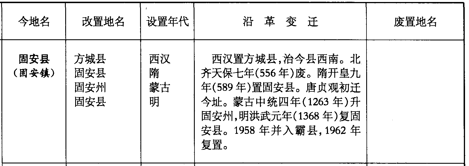 固安县(固安镇)方城县固安县固安州固安县西汉隋蒙古明西汉置方城县,治今县西南。北齐天保七年(556年)废。隋开皇九年(589年)置固安县。唐贞观初迁今址。蒙古中统四年(1263年)升固安州,明洪武元年(1368年)复固安县。1958年并入霸县,1962年复置。