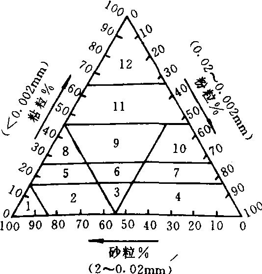 释义 | 国际制土壤质地分类international classificationsystem of soil texture1930年第二届国际土壤学会通过的土壤质地分类(附粒级划分)。系根据砂粒、粉粒及黏粒三种粒级百分组成制定的土壤质地分类,并把三种粒级的百分数构成等边三角形三个边,组成国际制质地分类三角图。按各粒级百分数组成比例,划分为砂土类、壤土类、黏壤土类及黏土类,再细分为12个质地名称。 国际制土壤质地分类三角图 土壤质地名称:1.砂土及壤质砂土 2. 砂质壤土 3. 壤土 4. 粉砂质砂土 5.砂质黏壤土 6. 黏壤土 7. 粉砂质黏壤土 8.砂质黏土 9. 壤质黏土 10. 粉砂质黏土 11. 黏土 12. 重黏土 国际制土壤质地分类表