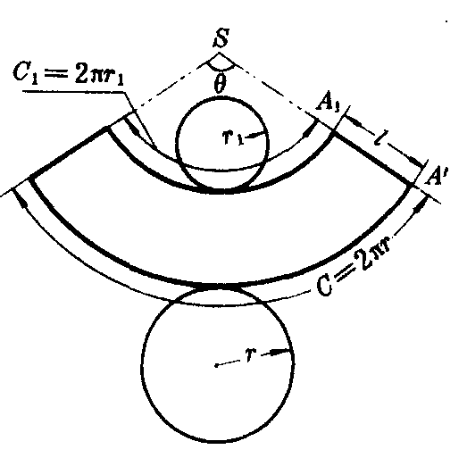 圆台的侧面展开图是一个大扇形去掉一个小扇形,通常把这样的图形叫做扇环.大扇形的弧长等于圆台下底圆的周长c,小扇形的弧长等于圆台上底圆的周长c1,扇形的圆心角θ=r-r1/l×360°.圆台的表面展开图如图所示.