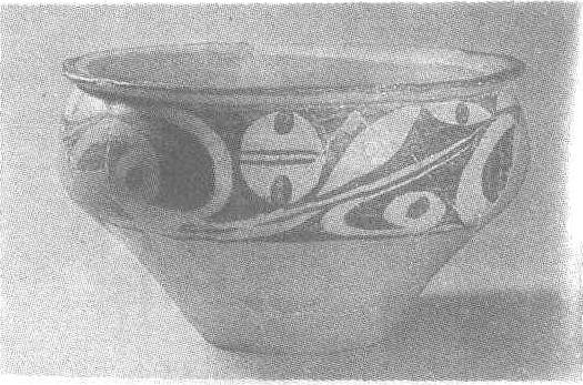 新石器时代仰韶文化庙底沟类型。高22.3厘米,口径38.3厘米。1956年河南省陕县庙底沟出土。北京中国历史博物馆藏。这是一件典型的庙底沟类型彩陶器,细泥红陶手工制成。平折沿,腹壁外斜至中部向里内收,平底。盆沿饰黑彩,外壁以留白的方式用黑彩绘出弧线纹和圆点纹。从形制到纹饰皆为判定庙底沟类型彩陶器的标准器。仰韶文化见“小口尖底红陶瓶”条目。