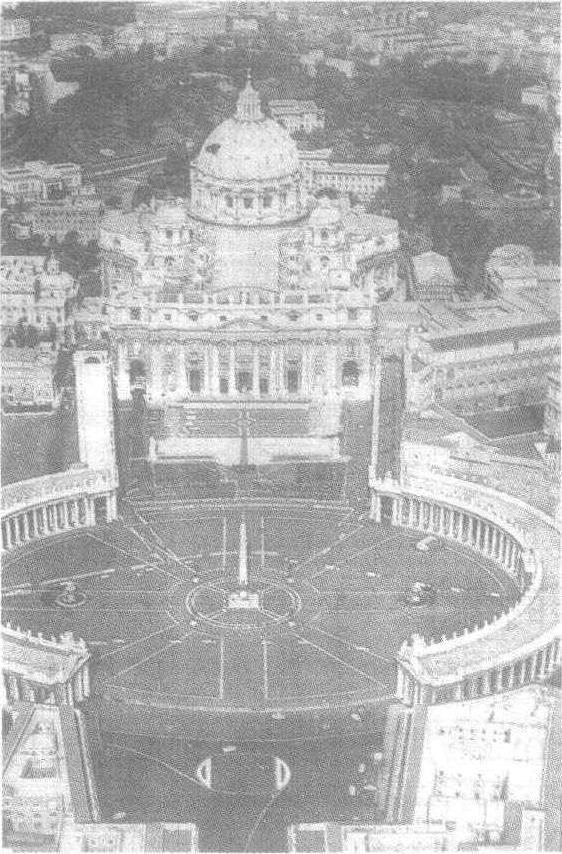 世界上最大的天主教堂,位于罗马的梵帝冈,是意大利文艺复兴建筑的代表作。1506年始建,拉斐尔和米开朗琪罗等许多艺术家参加过设计和施工,历时200多年完成。大厅平面如十字架形,长213.4m,两翼长137m,中心覆盖穹顶,内径41.9m,从穹顶上部采光塔的十字架塔顶到地面高137m,是当时最高的建筑。内墙以各色大理石、壁画、雕像装饰,外墙以灰华石和柱式装饰,显得富丽堂皇。教堂前以柱廊围合成倒梯形和长圆形复合的广场,建于1655—1667年,倒梯形利用了空间近大远小的错觉,加深了空间的深度感和广度感,使教堂更显得高大,广场更显得深远,这是巴洛克式广场运用透视原理,增强空间视觉效果的常用做法。圣诞之夜每年由梵帝冈教皇主持的十分隆重的圣诞节弥撒均在此举行。