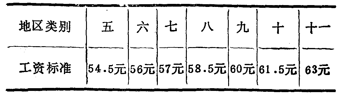 指同一工资等级在不同地区之间的工资差别,简称“地区差”。地区工资差是根据各地经济发展水平、自然条件、物价水平和历史上形成的生活水平确定的。1956年我国工资改革时,将全国分成十一个地区类别,一类地区工资标准最低,十一类地区最高。如当时规定的五至十一类地区某一类职工某一级的工资标准如下表:
