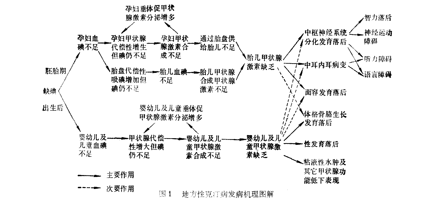 释义 | 地方性克汀病 地方性克汀病多发生在地质性缺碘的地方性甲状腺肿流行的病区。病区患病率约为1%—5%。全世界约有1.9亿地方性甲状腺肿患者和300多万地方性克汀病人。我国已查明的地方性甲状腺肿病人约3500多万,地方性克汀病人25万多。还有众多的尚待查清的亚临床克汀病和各种智力低下。地方性克汀病患者身材矮小、四肢短粗、髋膝关节弯曲、甲状腺功能低下,智力及性功能发育障碍,及有不同程度的听力及语言障碍等。一般形容为“聋、哑、瘫、矮”。亚临床型患儿,常貌似正常,其表现为愚笨,学习成绩差,不识数,智商低于正常,轻度神经发育不全,听力轻度受损,完成精细动作能力差,身体发育常低于同龄人。克汀病的病因是孕期母亲缺碘,而使胎儿及新生儿缺碘致甲状腺发育不全,不能合成甲状腺素,甲状腺机能低下,影响了大脑发育,因而出现了呆小症。成年人每日需碘为100—250微克。碘主要来源于饮水和食物。推行食盐加碘是预防地方性甲状腺肿和地方性克汀病及减少碘缺乏病的患儿行之有效的方法。加碘量一般为0.5/万。食盐加碘要求均匀,注意防晒防潮,不要将盐罐放在日光下,炉台上和水缸边,对患有单纯性甲状腺肿的孕妇,应及早口服碘剂,以防胎儿甲状腺发育不全。另外,孕妇应多吃海带等含碘量高食物。由于克汀病患儿生后早期无明显症状,最好取脐血或足跟血几滴检查促甲状腺素(TSH),甲状腺素(T4)和三碘甲腺原氨酸(T3)浓度,进行早期诊断,以便及早补碘。由于脑和神经发育有阶段性,在生后3个月,出现脑细胞生长的第二高峰,这主要是神经胶质细胞的分裂,在这一阶段开始得到补碘治疗,据报道,有90%左右患儿的智商可达到正常范围,一旦错过时机,再给碘也将无济于事而遗憾终生。 ☚ 环境致畸原的检测 氟中毒 ☛ 地方性克汀病又称“地方性呆小病”。在地方性甲状腺肿流行区出现的一种先天性地方病。胎儿和婴幼儿在发育期缺碘,导致甲状腺素缺乏,引起大脑、神经、骨骼和肌肉等发育迟缓或停滞。主要病症是呆小、聋哑、瘫痪。可用甲状腺素治疗。预防主要是防治地方性甲状腺肿。 地方性克汀病endemic cretinism为重度地方性甲状腺肿流行区出现的地方病。主要表现为发育落后、智力低下、眼距宽、眼裂小、鞍鼻、唇厚、伸舌、流涎、懒动、怕冷、体温低、脉缓、腹膨隆、皮肤粗糙、毛发干而脆,可伴有听力障碍及抽搐等。X线示骨龄发育落后、干骺闭合延迟等。 地方性克汀病 地方性克汀病地方性克汀病是在缺碘严重的地方性甲状腺肿病区出现的一种地方病。克汀病一词,原指欧洲阿尔卑斯山区常见的一种矮小、痴呆、聋哑病人。实际上本病分布是世界性的。患者出生后,即有不同程度的智力低下、身材矮小、听力及神经运动障碍,并有不同程度的甲状腺肿和功能低下。国内也有人称之为地方性呆小病。本病和地方性甲状腺肿的关系极为密切,两者主要病因是一致的,通过碘盐或碘油预防措施,可以有效地控制本病的发生,以至最终消灭。 临床表现 (1) 症状与体征: ❶智力低下系本病突出的症状,程度可轻可重,轻者能作简单的运算,参加较简单的生产及家务劳动,但效率不高; 重者可达白痴程度,大小便不能自理,甚至不能自动进食。此外,在病区常可见到一些中、小学生智力较差,学习成绩不良,甚至经常留级。 ❷体格发育落后,患者身材矮小,年龄越大越明显。下部量(耻骨联合上缘至足跟底)常比上部量为短,体重较轻。与躯干相比,头部相对较大,囟门闭合延迟。牙齿发育落后。国内若干病区报告25岁以上的地方性克汀病患者,长骨骨骺线尚未闭合。 ❸聋哑: 程度不同,但发生率远远超过非甲状腺肿流行区人群中的普通聋哑发生率。河北省承德市郊患者95%有不同程度的听力障碍,97.5%有不同程度的语言障碍。患者的听力及前庭功能常有异常,甚至病区少数所谓正常儿童也有听力及前庭功能障碍。 ❹甲状腺肿:在国内,本病患者伴有甲状腺肿的情况,因地区不同而有所不同。内蒙赤峰县徐家窝铺大队兼有甲状腺肿者占59%,均系Ⅰ~Ⅱ度。河北省承德市近郊占40%,其中2/3为轻度。河北省涉县仅为18.1%。 ❺克汀病面容:典型病例面部表情淡漠、傻笑及傻相。头大、额短、头发干、粗而脆,眼睑肿,睑裂呈水平状,眼距宽,鼻梁塌,鼻翼肥厚,鼻孔向前、唇厚、舌方、张口、伸舌、流涎,耳大而软,移动度大(图2、3)。 ❻甲状腺功能低下:临床表现有粘液性水肿,以颈部多见,表情淡漠,嗜睡,怕冷,少汗,体温低,脉搏慢,血压偏低,腹胀,便秘。患儿常可有脐疝,且腹部隆起。皮肤粗糙、干燥,常呈黄、灰白或灰黄色,表明皮肤血循环缓慢; 同时由于甲状腺激素分泌不足,使血液内胡萝卜素增加,引起发黄。有的患者心脏可略增大,收缩压低,脉压小,心搏出量降低。 ❼神经运动障碍:常有腱反射亢进、踝阵挛、膝阵挛及其它病理反射。少数下肢痉挛性瘫痪。有的尚有不自主运动,甚至抽搐或癫痫样发作。 图2 地方性克汀病患者面容(男,10岁) 图3 地方性克汀病患者面容,伴有甲状腺肿大女,11岁 (2)分型、分度:本病临床类型目前习惯于分为粘液性水肿型、神经型及混合型(即中间型)。 ❶粘液性水肿型:严重的临床甲状腺功能低下,生长迟滞,侏儒。 ❷神经型:精神缺陷,聋哑,痉挛性瘫痪,不同程度的甲状腺肿,几乎没有临床甲状腺功能低下的表现。以上两型的主要临床