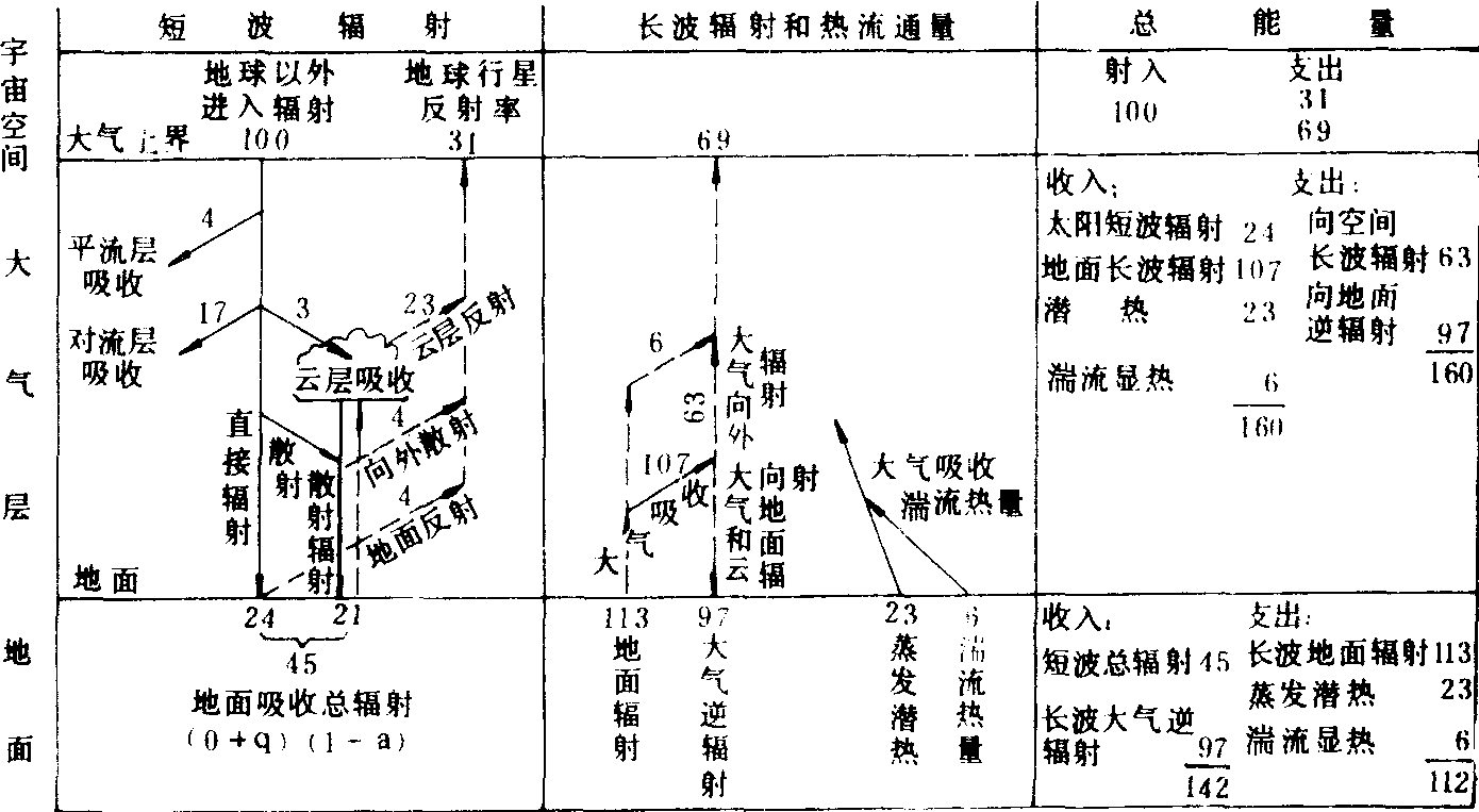 大气吸收了24个单位太阳辐射和107个单位的地面辐射而增温,并按其温度进行长波辐射。大气长波辐射中一部分射向地面,其值相当97个单位; 另一部分射向宇宙空间约63个单位。大气通过辐射过程总共吸收131个单位,而以长波辐射支出97+63=160个单位,全球大气的年平均辐射差额为-29个单位。亏损的热量由地面通过蒸发潜热输送23个单位,通过湍流输送显热6个单位以维持大气层和地面的热量平衡(见图)。