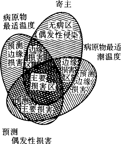 (根据Weltzien,H.C.,1978) 多种病害的分区系统通常是将发病地区划分为三个地带,即地带Ⅰ——中心地带,病害发生频率高并且经常流行成灾,损失严重;地带Ⅱ——中心周围地带,病害有波动,严重程度降低;地带Ⅲ——分布区的外层,病害的发生没有重要意义,不会造成为害。库克(Cook,W,C.,1925)等人采用了相应名称(见表)。在分析寄主和环境因素对病害分布的影响时,一种静态模型作图法(见图),有助于区分上表所列的不同亚区或地带。 划分三个地带的静态模型(仿H.C. Weltzien,1978) 地理植物病理学与地理学、植物学、气象学、生态学和植物病理学、植物病害流行学等学科密切联系。随着数学和计算机技术的飞速发展,可以依靠计算机处理大量调查数据,制作较精确的病害分布地图。地理信息系统(GIS)技术的应用将促进地理植物病理学的发展。 地理植物病理学geophytopathology又称植物病理地理学。研究植物病害的分布型及发生原因,以及从地理因素方面研究控制病害的学科。主要研究内容包括:病害的发生与分布范围,绘制病害分布的地理图;病害的分布型式;病害发生发展对环境的要求;病害流行的生态因子和地理因子;病害控制的地区性特点等。相关学科有地理学、地貌学、地质学、植物病害流行学和植病防治学等。 |