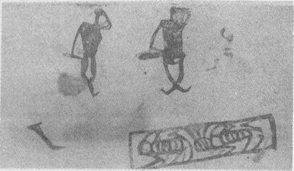 释义 | 地画 地画画在屋内地面上的图像。1982年10月在甘肃秦安县五营乡大地弯房基遗址中发现,属仰韵文化晚期,距今约5千年。此地画位于室内后壁的居住面上,用黑色颜料绘制成。经甘肃省博物馆文物保护实验室鉴定,黑色颜料为炭黑。画面占地东西长约1.2米,南北宽约1.1米。地画形象有人物和动物图案,上部正中一人,高32.5厘米,宽约14厘米,头部较模糊,犹如长发飘散,肩部宽平,上身近长方形,下部两腿交叉直立,似行走状。左臂向上弯曲至头部,右臂下垂内曲,手中似握棍棒状器。该形象右侧尚存一黑色颜料残迹,推测也应为一人物。左侧亦绘一人,高34厘米,宽13厘米,头近圆形,颈细长,肩左低右高,胸部突出,两腿交叉直立,似行走状,左腿下残缺,手臂姿势同前者。在正中人物的下方12厘米处,绘一略向右上方斜的黑线长方块,长55厘米,宽14~15厘米,框内画两个头向左的动物,左边的长21厘米,右边的长26厘米,究为何种动物,难以确指。地画人物形象,被考古工作者推断为“祖神崇拜”之物(《文物》1986年2期)。 ☚ 太湖石 岩画 ☛ |
