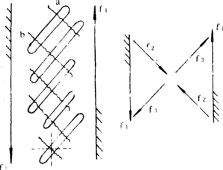 ❸扭动构造体系:上述两类构造带的走向分别与纬度或经度方向的一致性,反映了经向的或纬向的水平挤压或拉张作用,这是地壳构造的两个基本方向。但由于地壳组成物质的不均一性,使沿着纬向或经向的作用力发生变化,导致局部地区的地壳发生扭动,并形成各种扭动构造体系。根据它们的形态特征,又分为多字型构造、山字型构造、棋盘格式构造、八字型构造以及帚状构造、S型构造、反S型构造、歹字型构造等。其中多字型、山字型等构造在我国最为常见,更为重要。 多字型构造:地壳在力偶的扭动下,必然产生一系列斜列的压性构造(如褶皱、压扭性断裂、挤压带等)和与其直交的张性或张扭性断裂,二者的分布和组合形似“多”字(如图)。图中f1表示相对扭动的力;f2代表由扭力产生的压应力;f3代表由扭力产生的张应力;a代表由压应力产生的一系列压性结构(如褶皱),平行斜列,又称雁行式排列,这一现象可以在桌面台布上做实验,用两拇指隔一定距离相对上下扭动,则可以形成一系列雁行式小褶皱;b代表由张应力产生的断裂,与a垂直,组合一起类似多字。有时只有一组构造发育。此构造体系规模大小不等,大到数百平方公里甚至更大,小到在手标本上可见其痕迹。巨型多字型构造广泛出露于我国东部和东亚大陆濒太平洋地带。其主体构造为北北东向(一般为NE18°~25°)压性构造,称新华夏系构造。属于一级构造的为一系列沉降带和隆起带:最东边是第一隆起带,即东亚岛弧(由千岛群岛、日本群岛、琉球群岛、台湾岛、菲律宾群岛、加里曼丹岛等组成)。在这一隆起带的东侧为一系列深海沟;其西侧为由鄂霍次克海、日本海、东海、南海等构成的第一沉降带。再往西为第二隆起带,包括朱格朱尔山、锡霍特山、张广才岭、老爷岭、长白山,经朝鲜半岛的狼林山,再接我国的辽东半岛、山东半岛以及东南沿海一带的北北东向武夷山、戴云山等。由此往西为第二沉降带,由东北平原、华北平原、江汉平原等构造盆地组成。更西则为第三隆起带,由大兴安岭、太行山及雪峰山等湘黔边境诸山组成。在它的西边则为由呼伦贝尔—巴音和硕盆地、鄂尔多斯盆地、四川盆地等构成的第三沉降带。这些北北东向的一级隆起带和沉降带,与前述东西构造带相复合,便构成了我国东部地区的构造骨架。李四光认为,这一巨大多字型构造体系,显然是南北向力偶作用造成的。在中生代末到第三纪末,中国大陆东部受到由北向南的挤压,遇到太平洋底的阻力,因太平洋底由硅镁层组成,比由硅铝层构成的中国大陆牢固得多,相应就给了它一个由南向北的力,构成力偶,因而形成亚洲东部一系列的新华夏构造。在我国东部的新华夏系隆起带内,岩浆岩非常发育,伴生有许多内生金属矿床,如江西钨矿、湘黔边境的汞矿以及铁、铜等矿。在新华夏系沉降带内,自中生代以来接受了大量沉积,基本控制了我国东部生油盆地的分布,如大庆、大港、胜利等油田均属此范畴。新华夏系构造形成时间较晚,局部地区现在仍有活动,属于活动性构造体系,因此它也是研究我国东部地震活动不可忽视的重要地质因素。