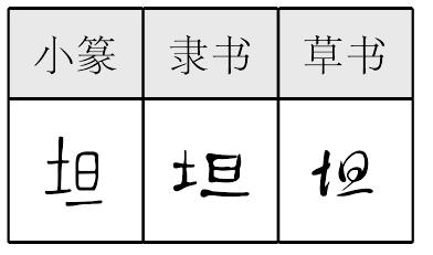 tǎn形声,从土,旦声,本义为平坦,平直宽广,引申为直率开朗、心里安定或平静等。 |
