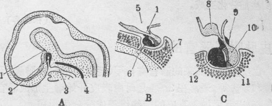 释义 | 垂体的发生 垂体的发生垂体为位于脑底部下丘脑下方能分泌多种激素的重要内分泌腺。其原基由二个部分所组成(见图): 一个来源于原始口腔顶部口咽膜前方的外胚层向间脑底壁外突所成的Rathke囊,以后形成垂体前叶、结节部和中间部,即腺垂体。另一个是间脑底壁局部向腹侧外突而成的垂体漏斗囊,故来源于神经外胚层,后来演变为垂体的神经部、漏斗柄和正中隆突,即构成神经垂体。此二部分囊样突起在人胚第3周末出现。到第6周时,两个部分已彼此相遇合形成垂体原基(图中A)。第7~8周时,Rathke囊的柄部萎缩,与原始口腔的通道封闭而失去连接,偶尔,部分留存成为咽顶壁内的咽垂体。第10~11周时,垂体漏斗囊增大成为神经部(叶),其基部变长,形成漏斗柄和漏斗灰结节的正中隆突区(图中B)。与之相贴的Rath-ke囊形成为双层的杯状结构,其内壁软薄发育较差,成为腺垂体的中间部,它与神经部构成了垂体后叶。Rathke囊杯状结构的外壁(前壁)较厚,细胞增殖活跃形成为膨大的垂体前叶,其顶部形成结节部,其囊腔最后在前叶与中间部之间成为残留的缝隙状腔隙(图中C)。至胚胎3~4月时,垂体前叶开始出现三种腺细胞,嗜酸细胞(α细胞)的分化略早于嗜碱细胞(β细胞)。但胚胎时期,大多数为嫌色细胞(γ细胞),其总数较成体时为多。 垂体的发生 A. 第6周胚胎头部矢状切面 B. 第11周脑垂体矢状切面 C. 第16周脑垂体矢状切面 1.垂体漏斗 2.Rathke囊 3.口腔 4.脊索 5.间脑腔 6.咽垂体 7.蝶骨 8.视交叉 9.结节部 10.神经部(后叶) 11.中间部 12.前叶 在胚胎3~4月以后,已能测出促性腺激素(FSH及LH)、促甲状腺激素(TSH)、促肾上腺皮质激素(ACTH)和生长激素(GH)。在发育过程中,垂体前叶逐渐为来源于颈内动脉分支和间脑底壁表面的血管丛的毛细血管所侵生,成为富含血窦的腺体组织,腺细胞排列成索状或团状,与血窦交错成网状。中间部在人类不发达,也有上述三种细胞的分化,但以嗜碱细胞为主。 垂体的神经部在第3月时也发生了组织分化,其主要成分来源于垂体漏斗囊的胶质细胞,一部分在胚胎后期分化为垂体细胞,具有短而有分支的突起;另一部分细胞则分化为室管膜细胞,但很少有神经细胞的分化。神经部也有丰富的血管,并有由丘脑下部核团发出很多神经纤维穿行其中。神经部有分泌加压素和催产素的功能,但这些激素都在出生后才产生。 ☚ 内分泌腺的发生 甲状腺的发生 ☛ |