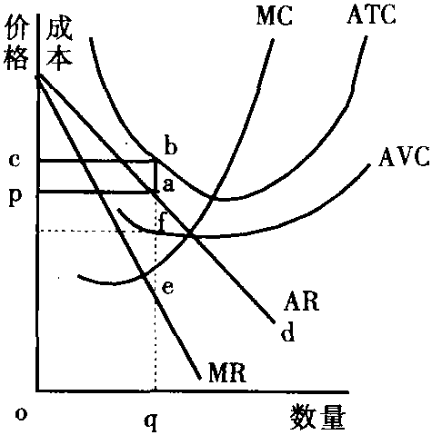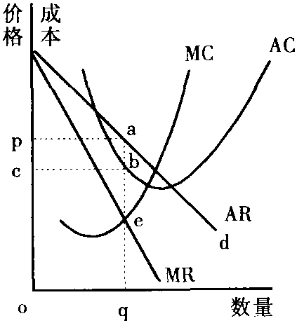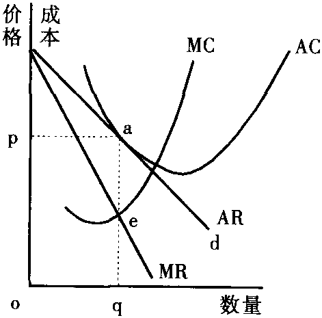❶平均收益大于平均总成本,厂商获得超额利润。如图1所示,横轴代表产量,纵轴代表价格和成本。边际成本曲线(MC)和边际收益曲线(MR)相交于E点,由此决定均衡产量为q,由产量q在需求曲线d(即平均收益曲线AR)上的对应点a可以确定价格为p,在平均总成本曲线(AC)上的对应点b可以确定平均成本为c。垄断厂商的总收益为矩形opaq,总成本为矩形ocbq,二者之差是超额利润(即矩形pcab)。此时,厂商继续生产。