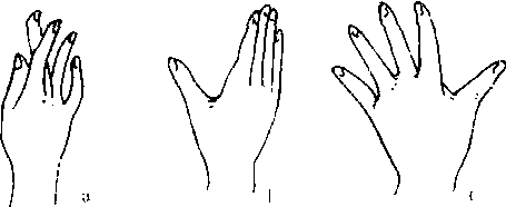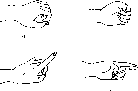 ❻单指:食指挺直,拇指与中指尖在掌心前相搭,其它二指自然内屈(图c)。