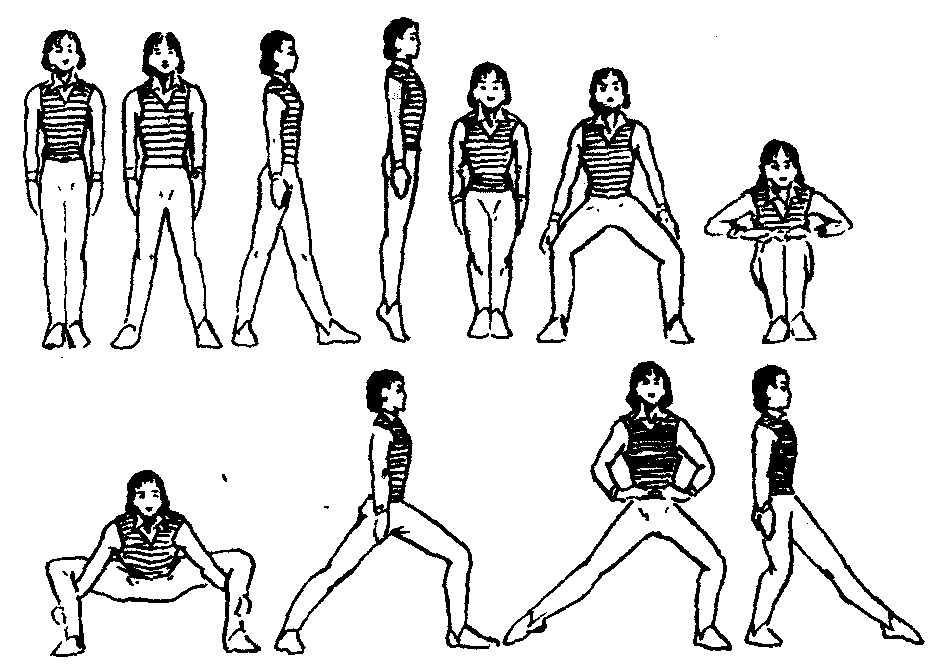 是练习健美操的基本姿势之一。站立的基本姿势为:头正直,略收颏,梗头,两肩下沉,背部挺直,收腹立腰。臀部和两腿肌肉收紧,目视前方。站立两腿并拢,两脚平行。分腿站立上体直立,两脚前、后或左、右开立,两脚与肩同宽或大于肩,重心在两脚之间。提踵立脚跟提起,用前脚掌站立。蹲立包括半蹲和全蹲,脚尖向前,大腿与小腿约成90°为半蹲,小于90°为全蹲。可分为并腿蹲和分腿蹲。弓步一腿屈膝,一腿伸直,有前弓步、侧弓步和后弓步。(见图2—3—17)